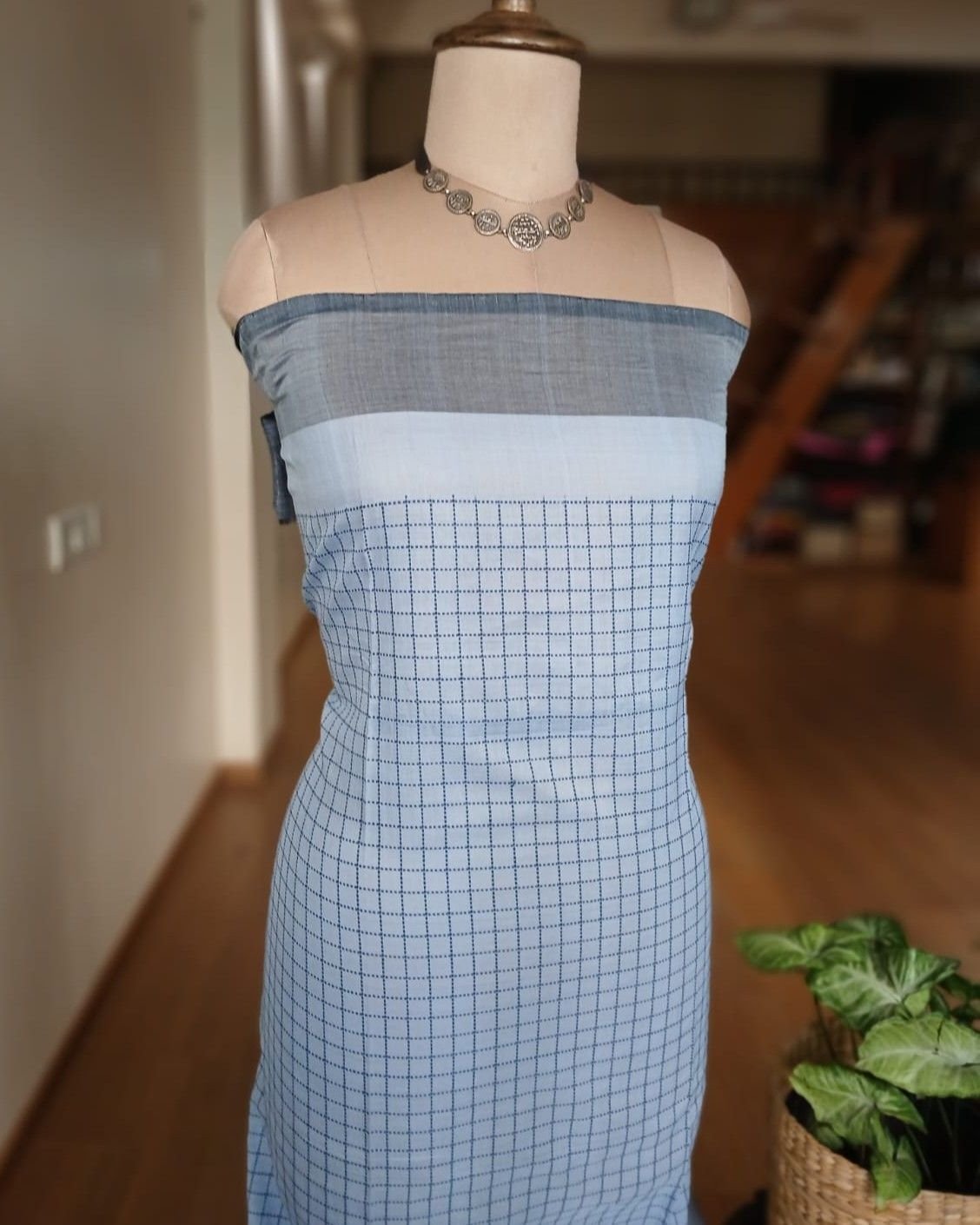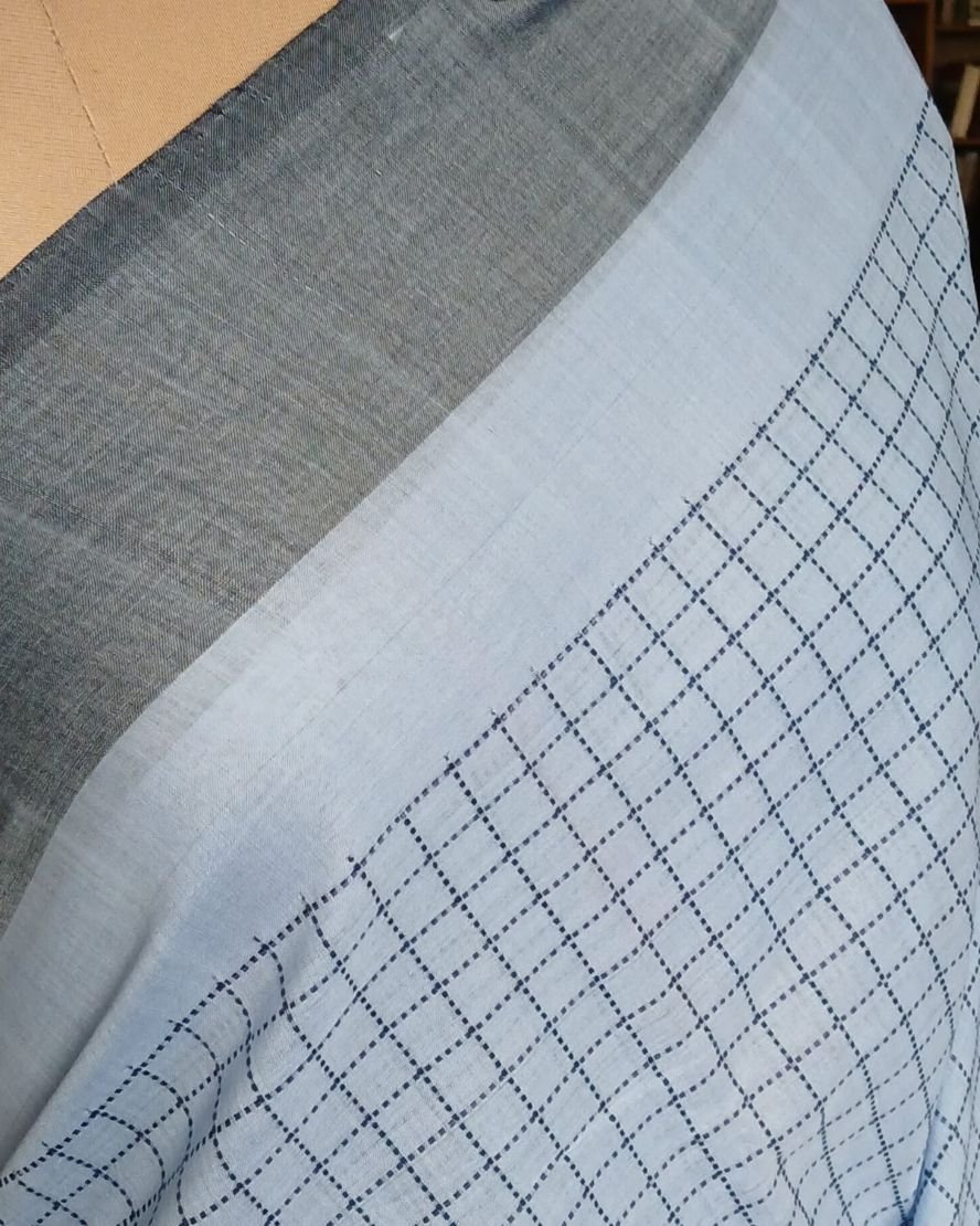 This saree is woven with a checked design in the body, with extra dobby thread.