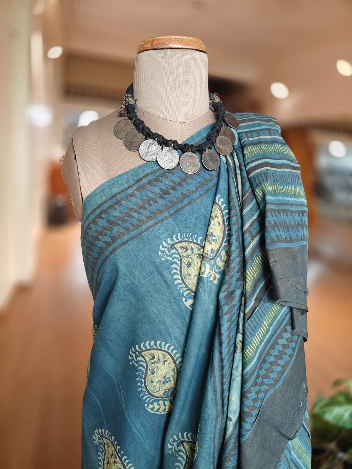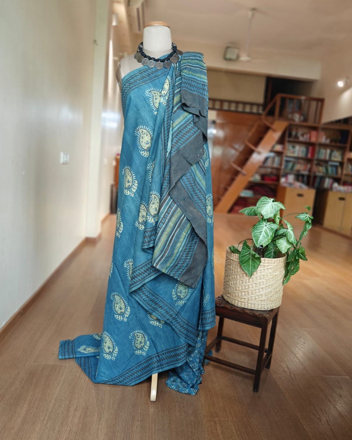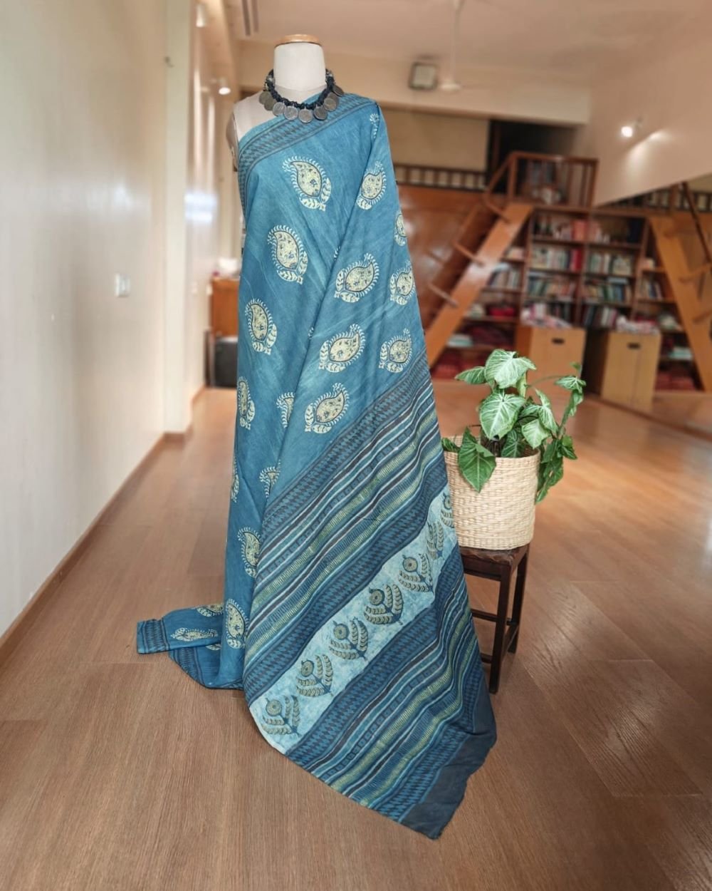 Natural dyes hand printed saree – Indigo Paisley
