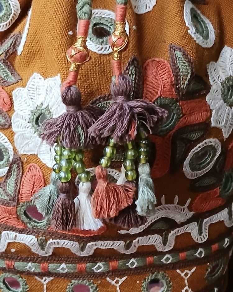 There are tassels at the edges, and the potli is embellished with mirrors. The base is circular.