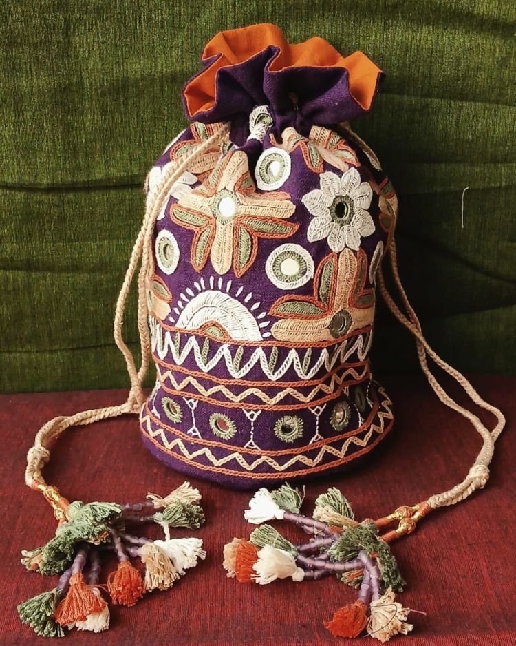 Paako hand-embroidered drawstring potli bag from Kutch. See more details below.