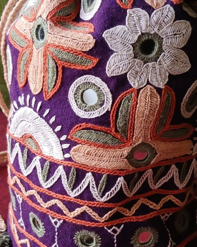 This type of paako embroidery is done by the Sameja and Marwada communities. This potli is from Kala Raksha, a non-profit in Sumrasar which works for the welfare of these communities.