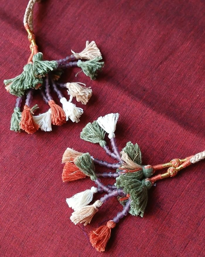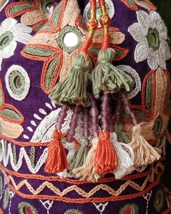The stitches are dense and well-finished, which is what the word paako means. There are tassels at the edges, and the potli is embellished with mirrors. The base is circular. There is good quality lining inside with no hanging embroidery threads.