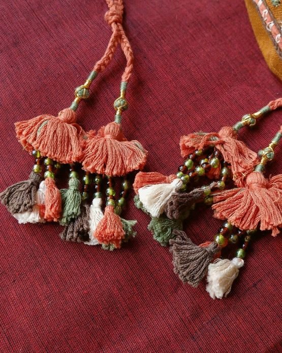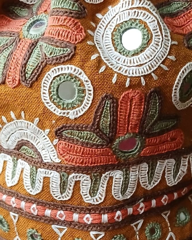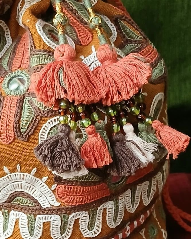 This type of paako embroidery is done by the Sameja and Marwada community. There are tassels at the edges, and the potli is embellished with mirrors. The base is circular.