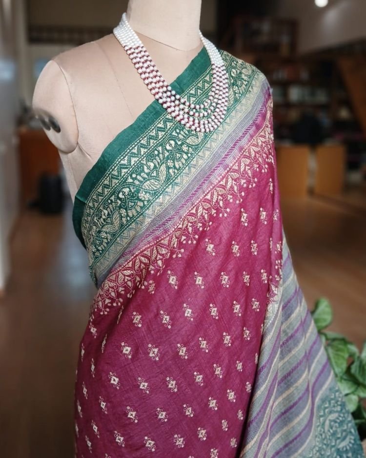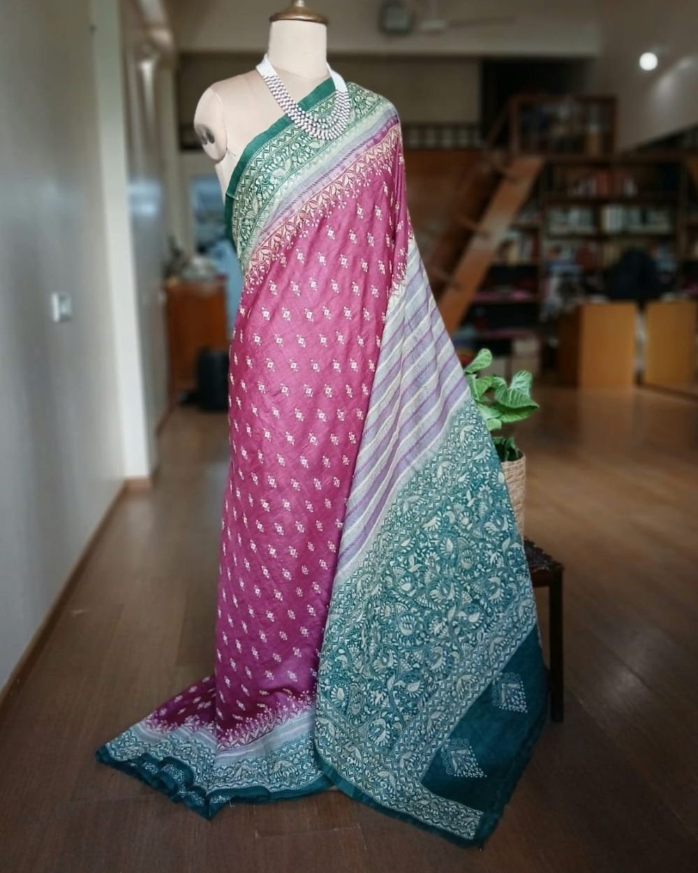 Collector’s Delight – PadmaShree Takdira Begum’s Tussar Silk Kantha Saree with contrast borders and pallas.