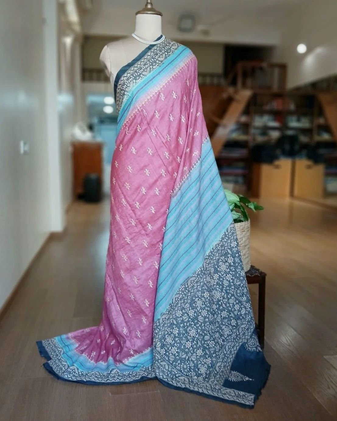 There is intricate kantha on the palla. Hand-embroidered in Bolpur, West Bengal.
