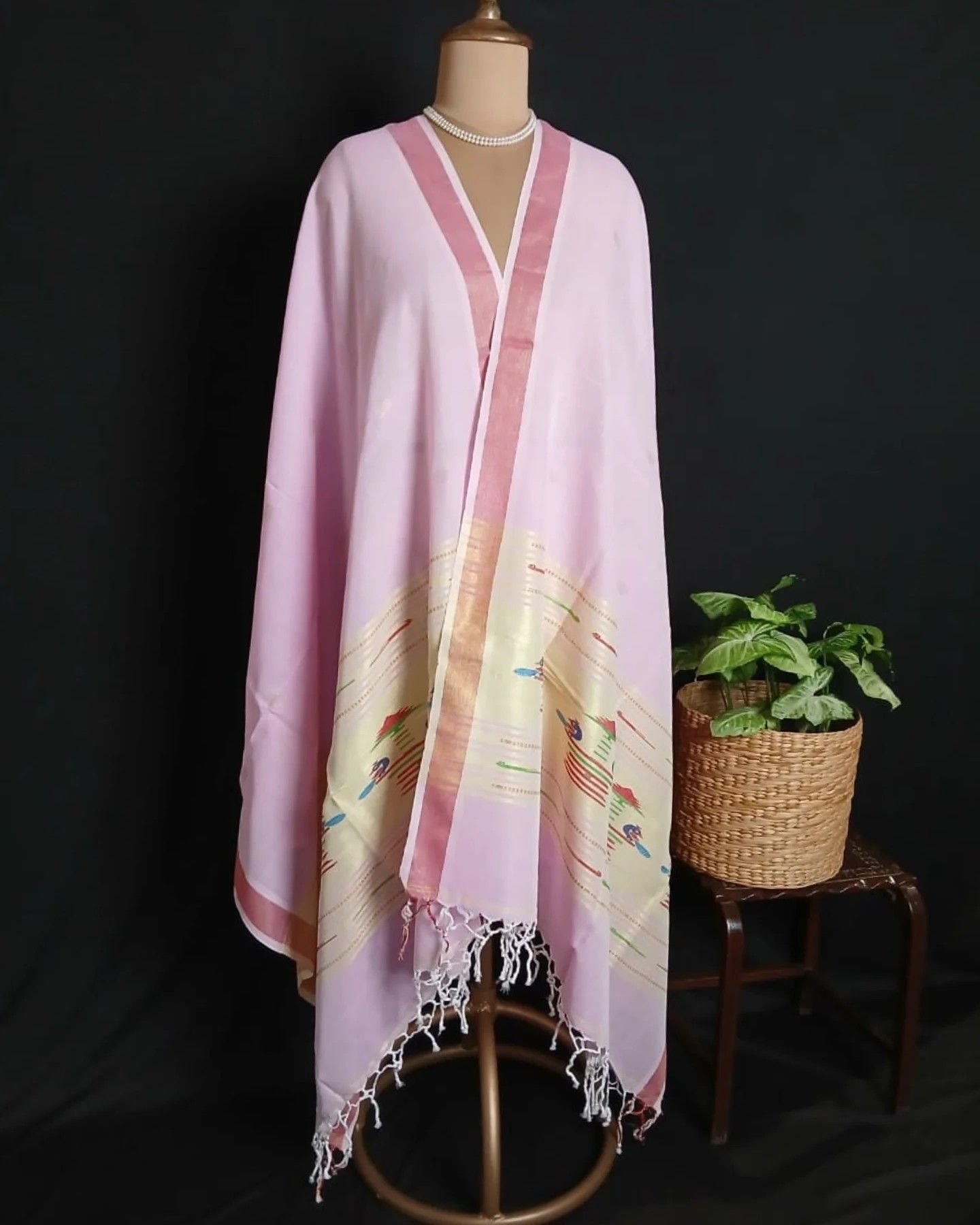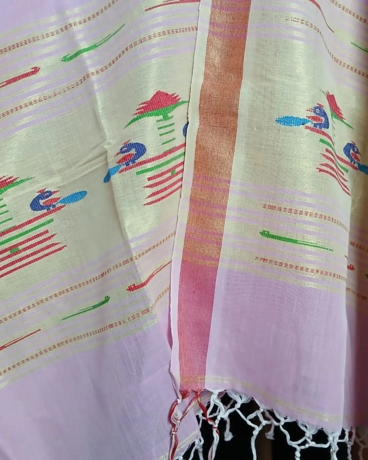 Paithani handweave Cotton Dupatta with peacock motifs on both sides, with zari work.