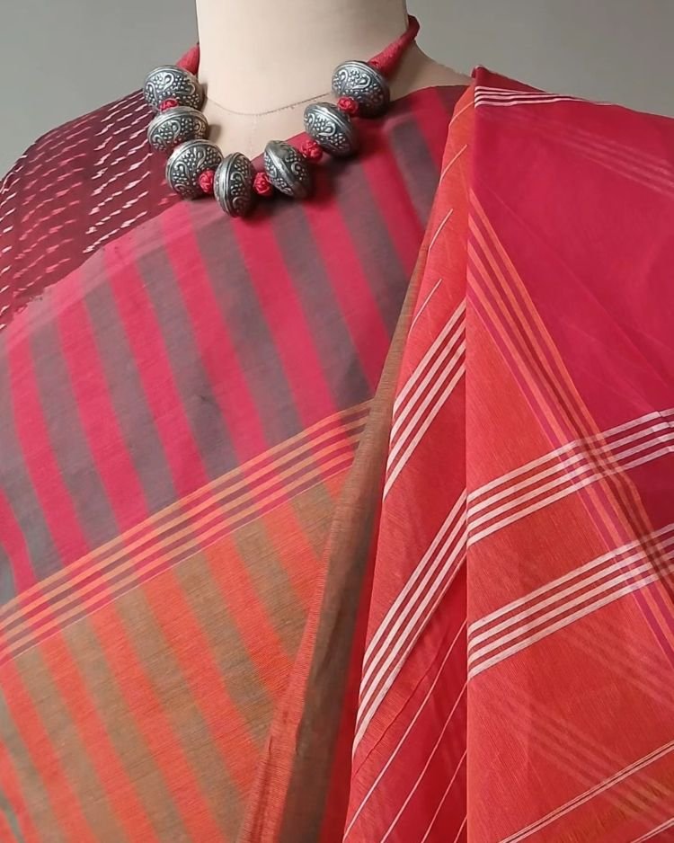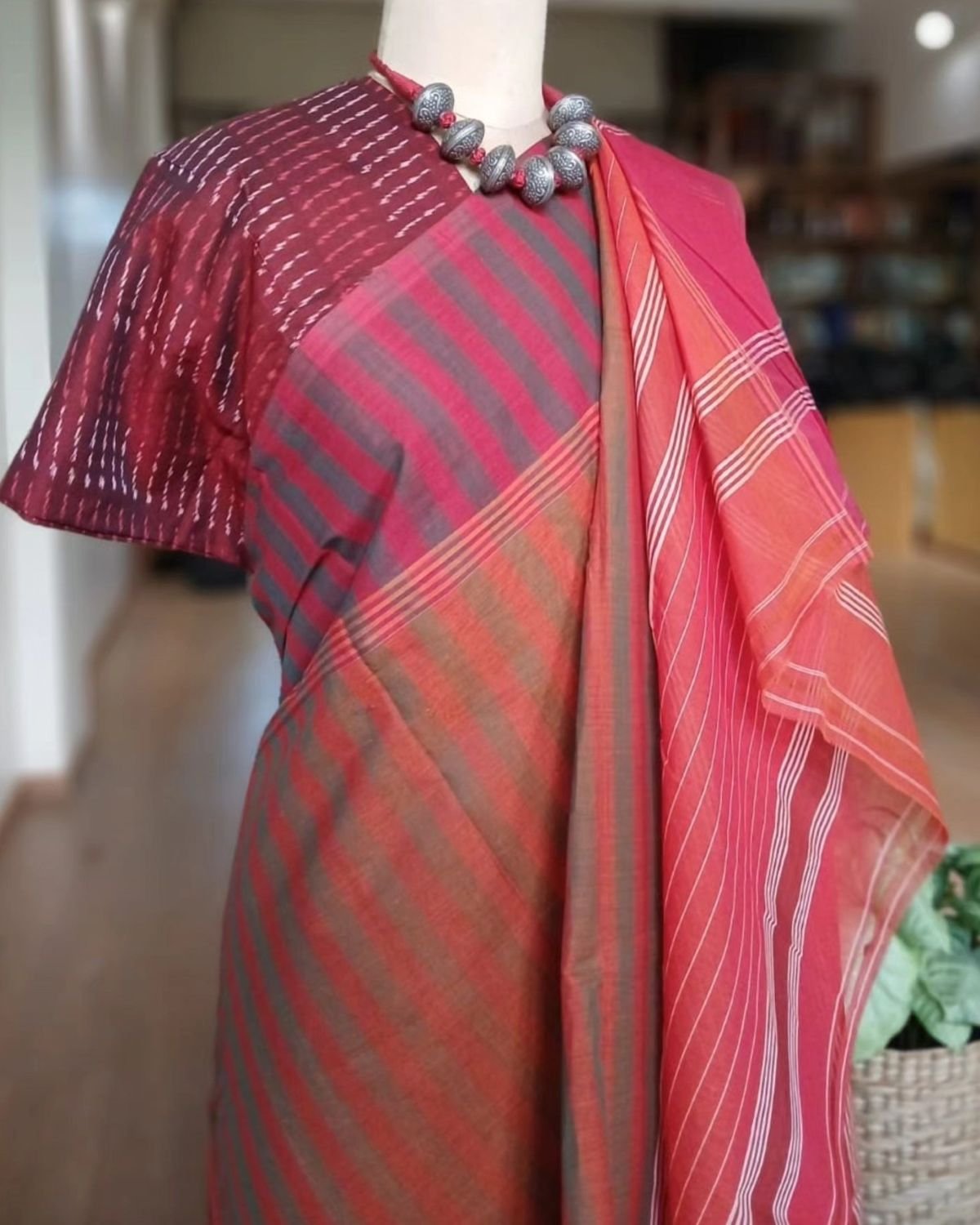 Paramakudi Handweave Cotton Saree from Tamilnadu, combined with single ikat cotton blousepiece from Telangana.