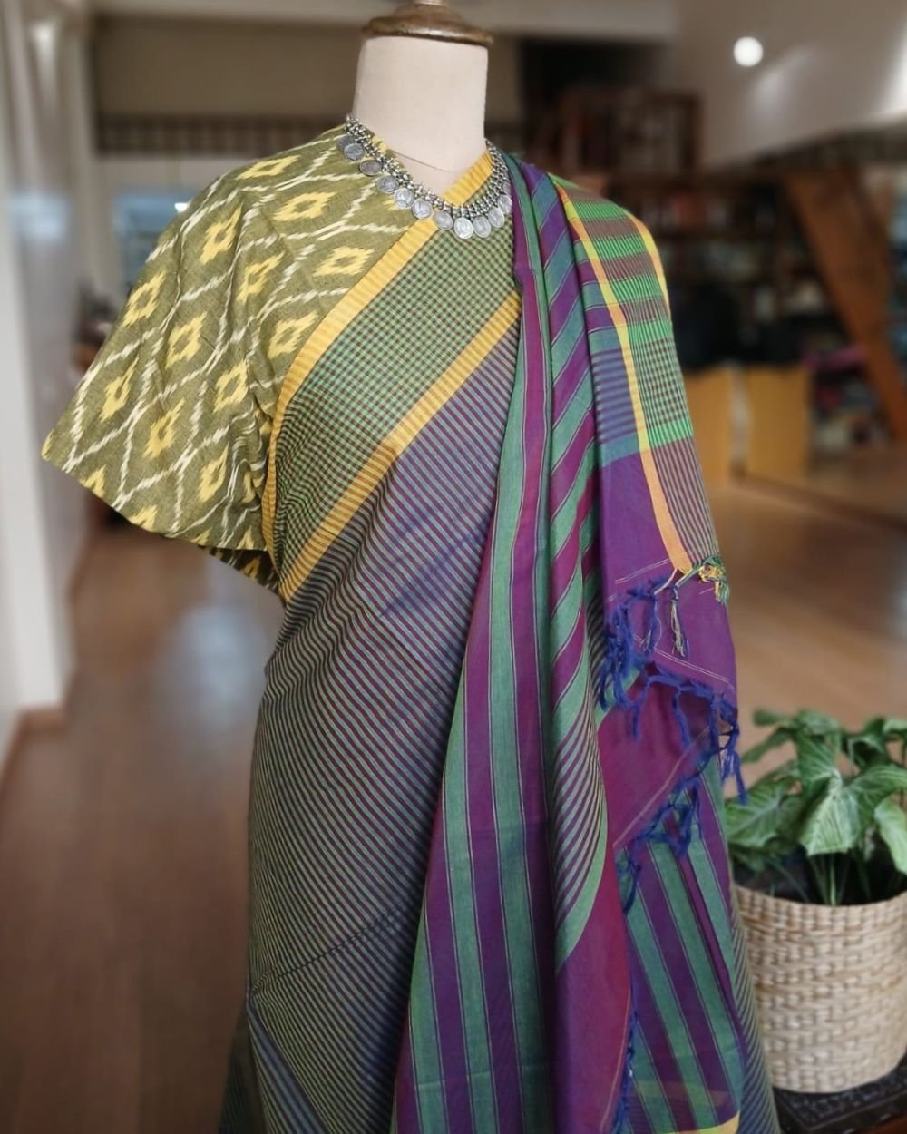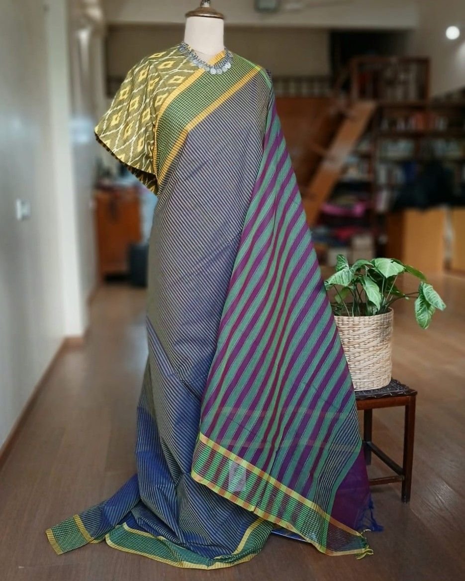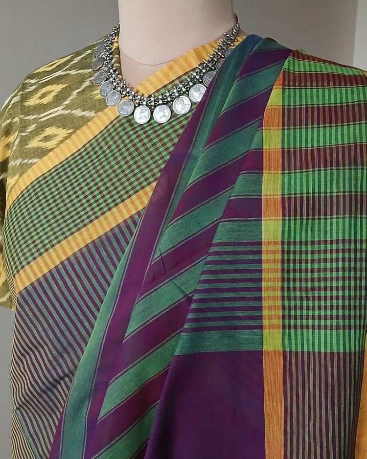 Paramakudi Handweave Cotton Saree from Tamilnadu, combined with single ikat cotton blousepiece from Telangana.