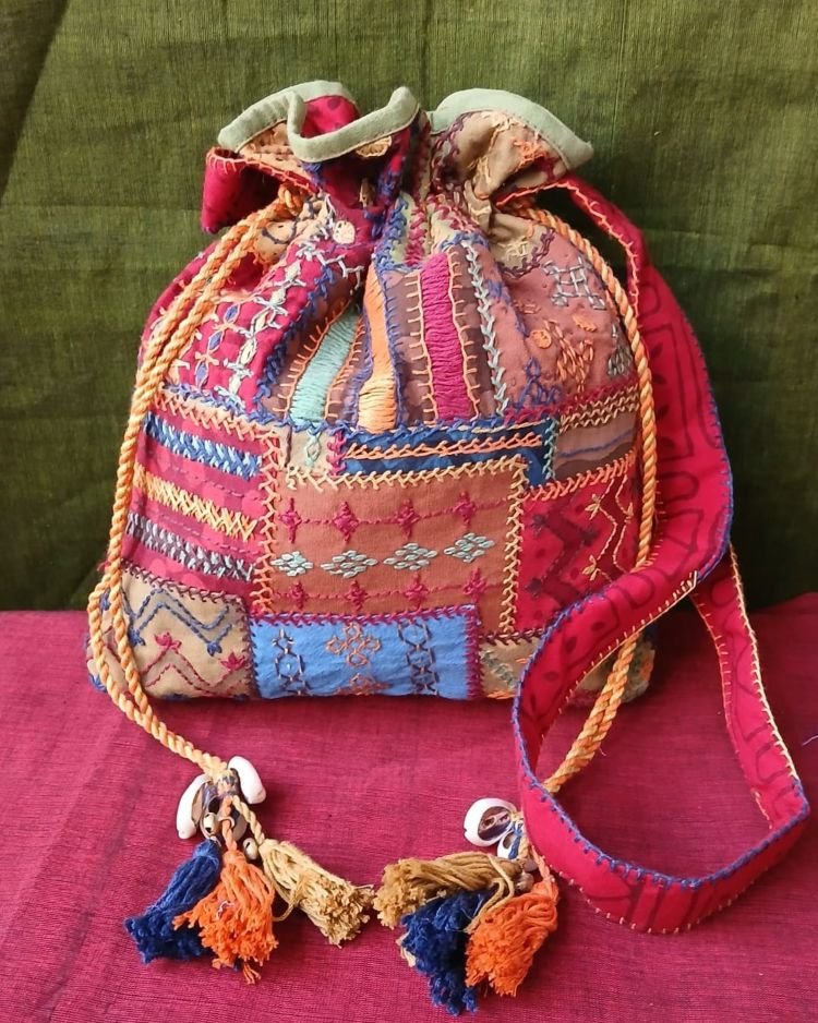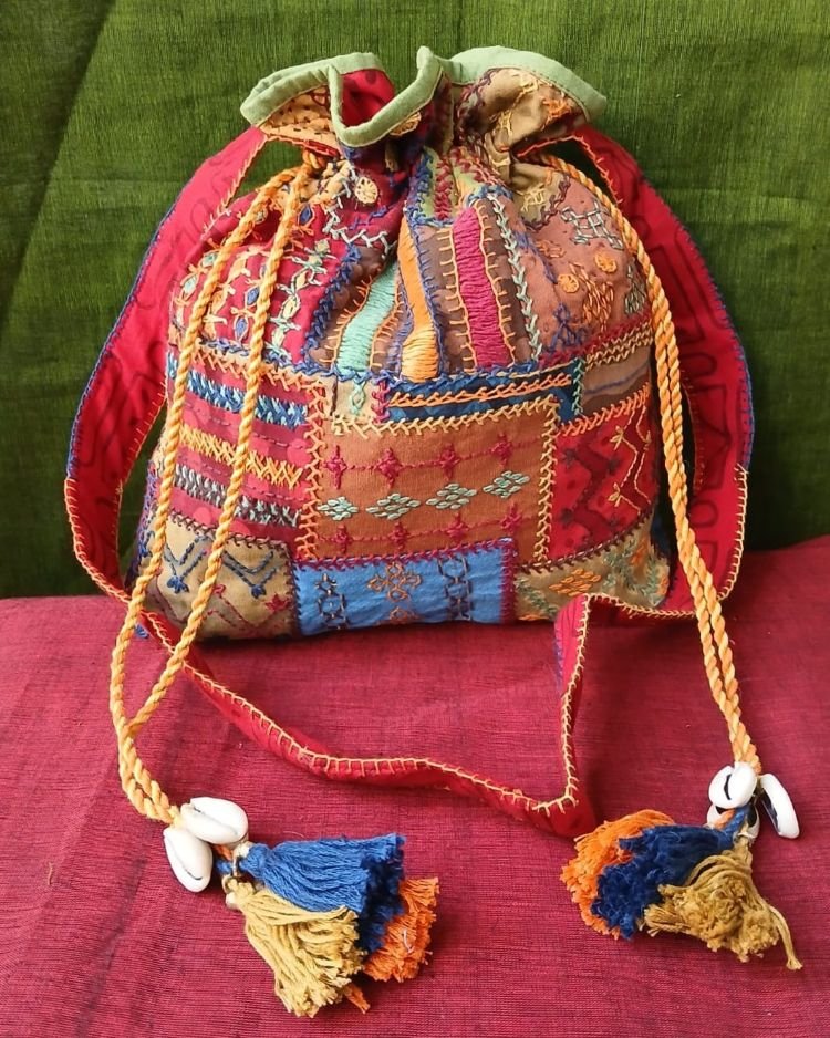 Patchwork embroidered drawstring bag from Karnataka.
