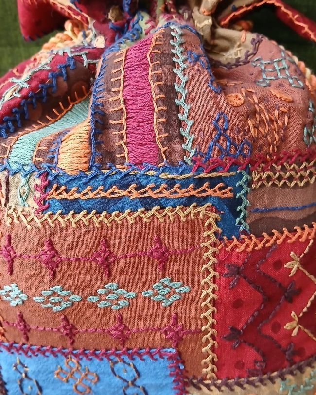Patchwork embroidered drawstring bag from Karnataka. See more details below