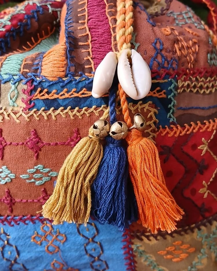 The embroidery is Lambani and the drawstring is embellished with real cowrie shells.