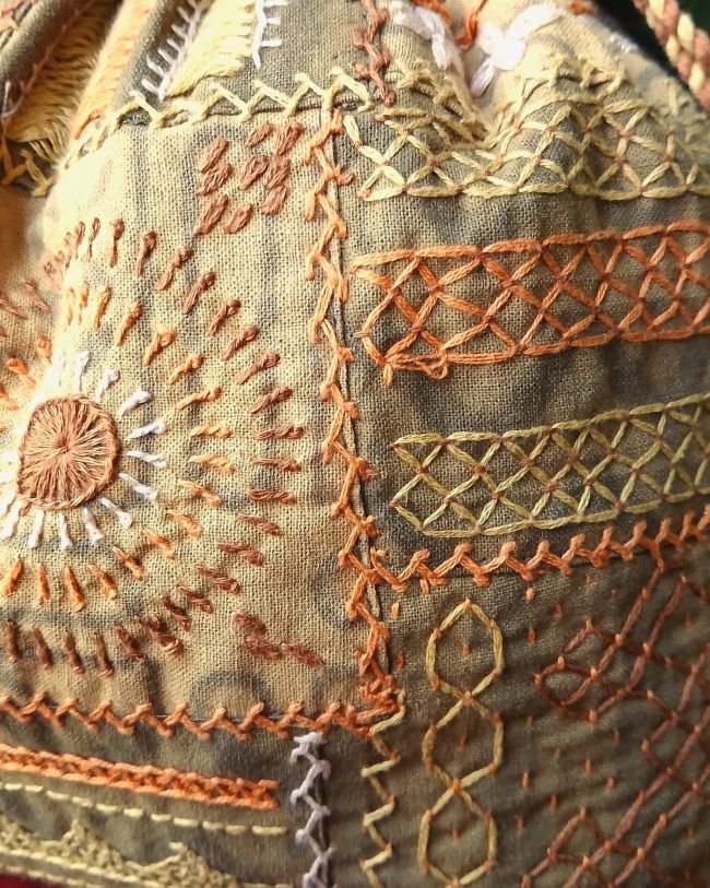 Patchwork embroidered drawstring bag from Karnataka. See more details below