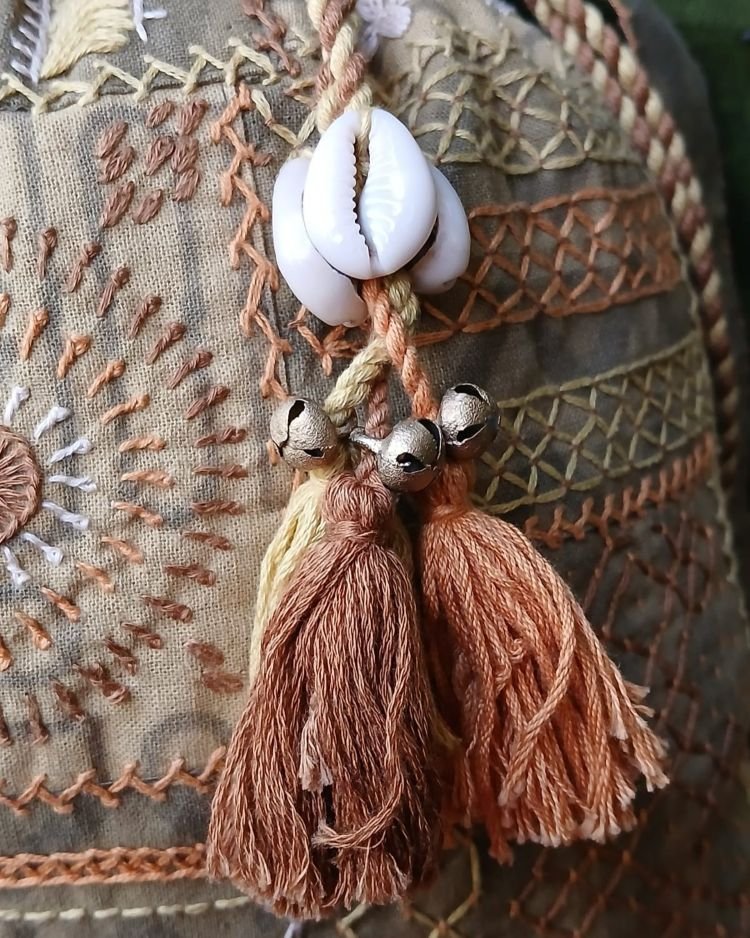 The embroidery is Lambani and the drawstring is embellished with real cowrie shells.