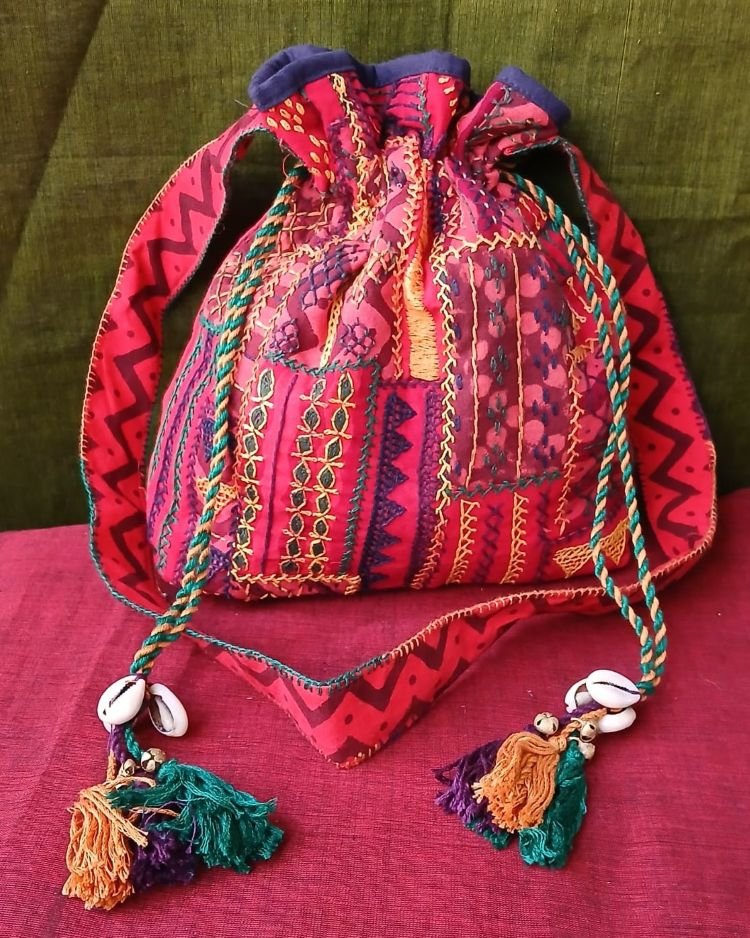 Patchwork embroidered drawstring bag from Karnataka.