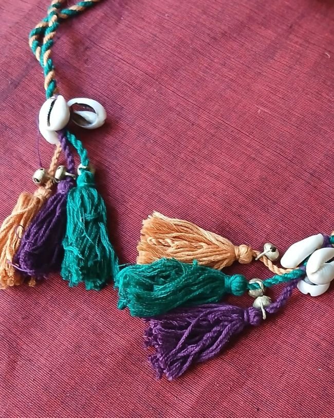 The embroidery is Lambani and the drawstring is embellished with real cowrie shells.