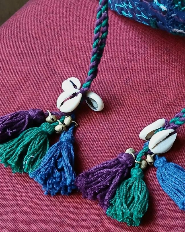 The embroidery is Lambani and the drawstring is embellished with real cowrie shells.
