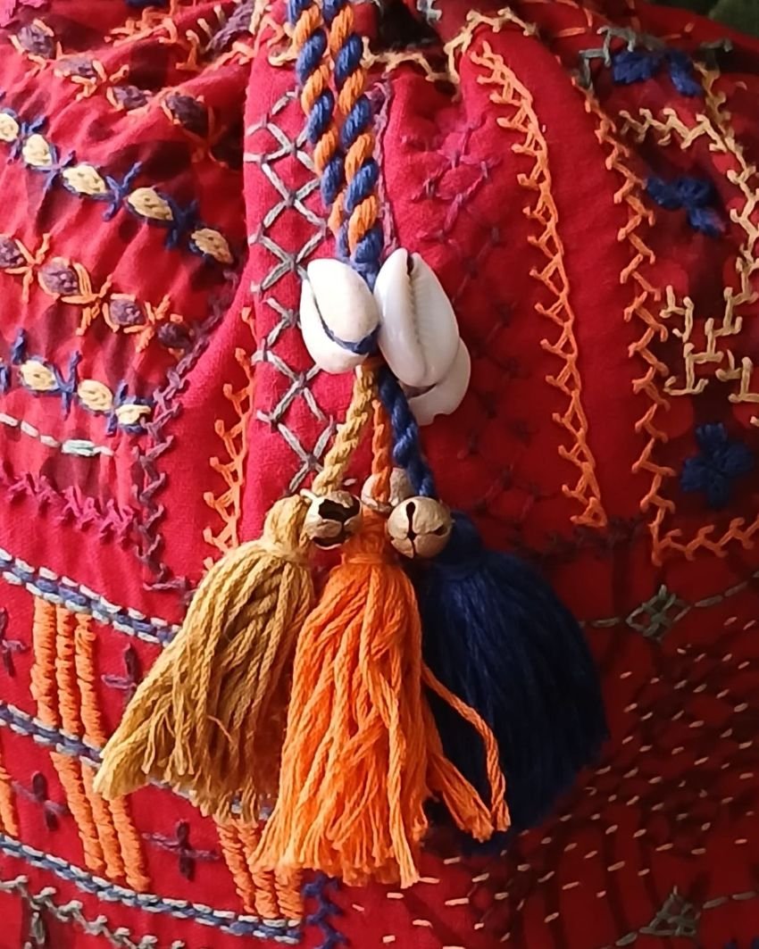 The embroidery is Lambani and the drawstring is embellished with real cowrie shells.