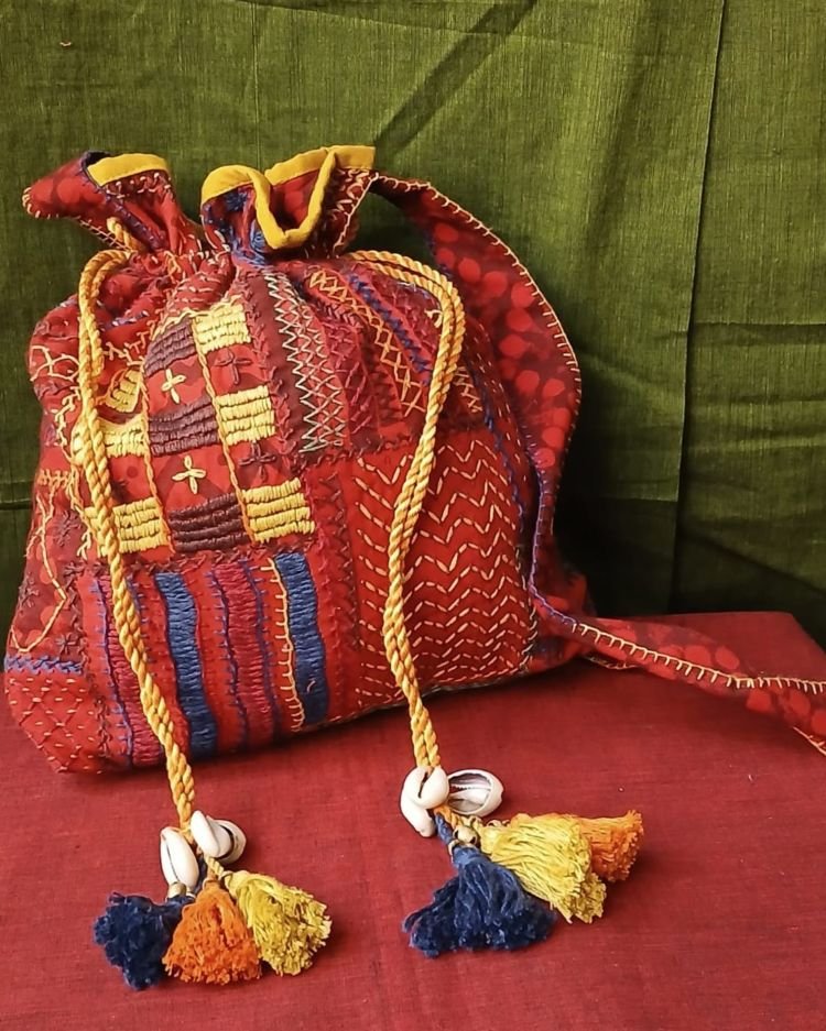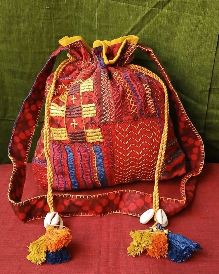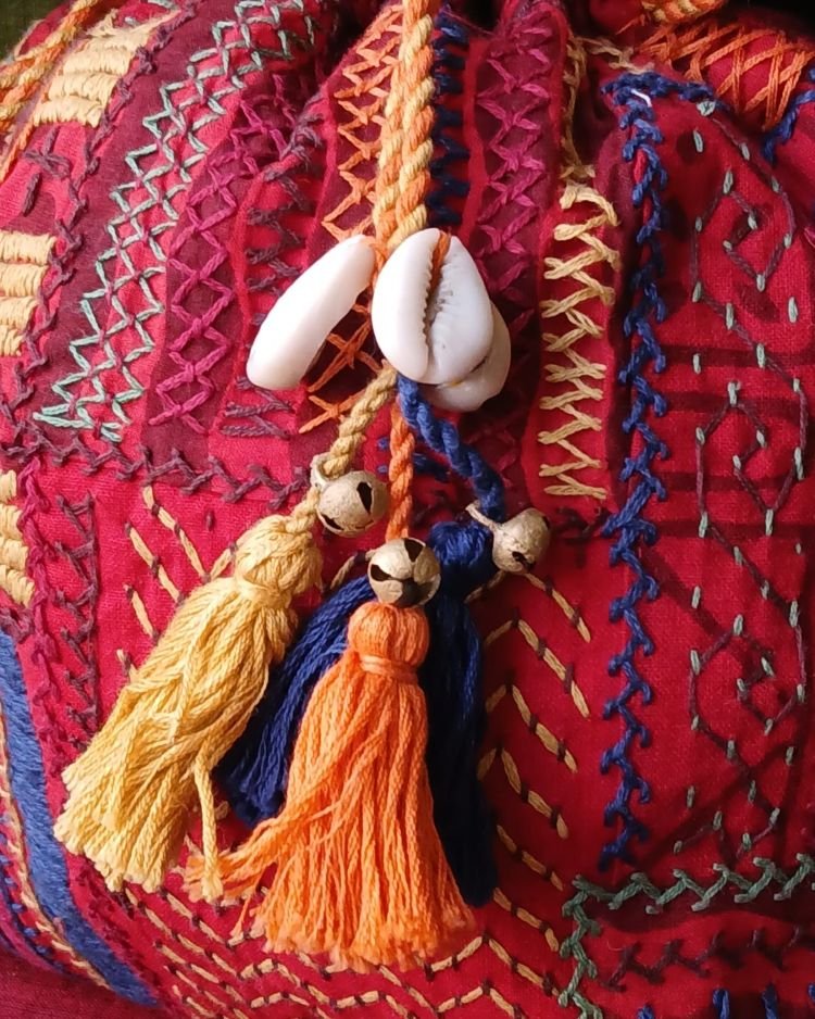 The embroidery is Lambani and the drawstring is embellished with real cowrie shells.