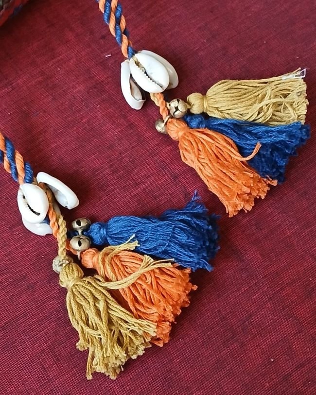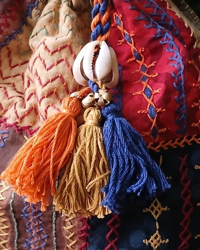 The embroidery is Lambani and the drawstring is embellished with real cowrie shells.