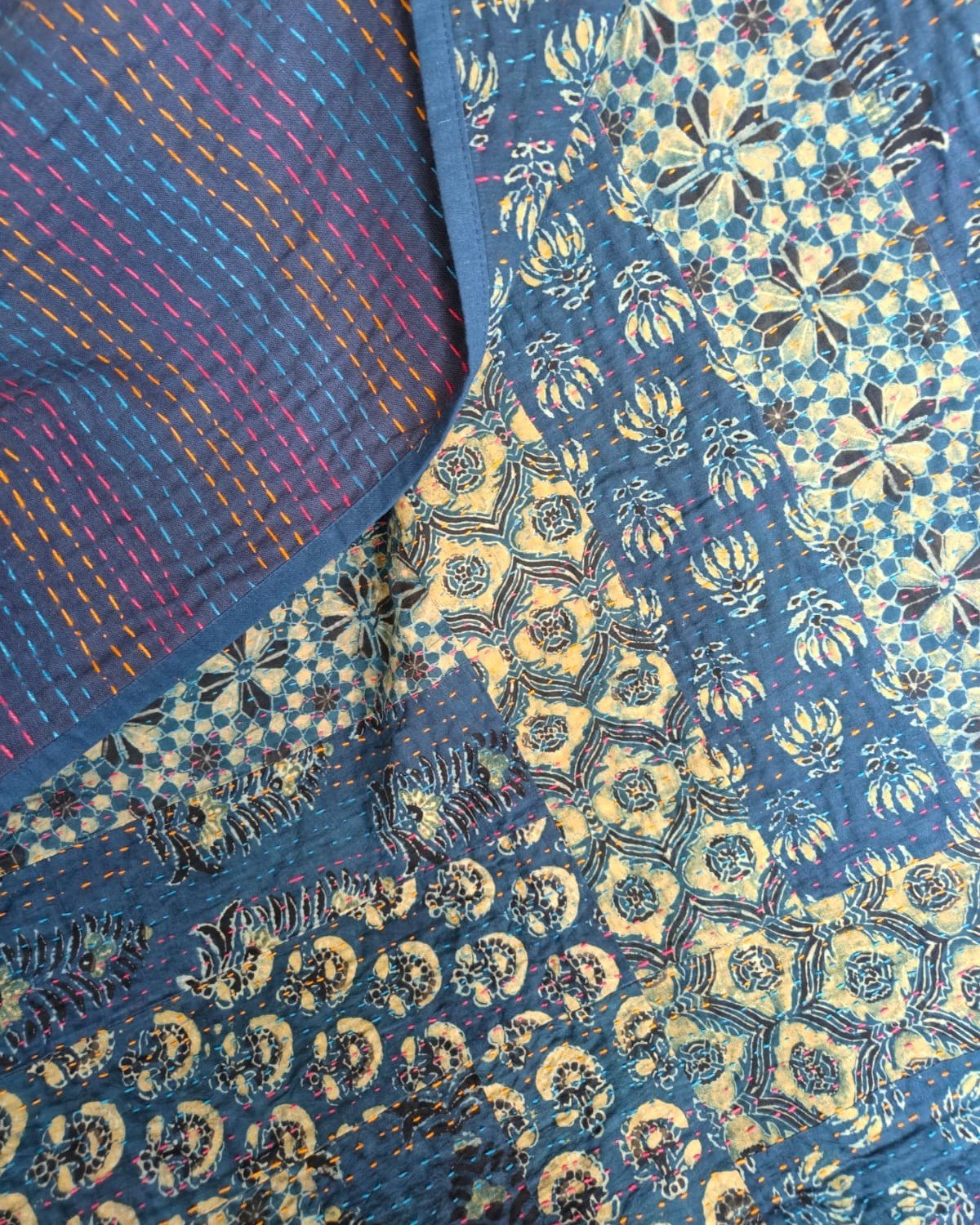 It has natural dyes hand-block Ajrakh on one side, which has been patchworked together in an attractive design. The reverse is plain where you can see handstitch tagai, and the edges are nicely finished with borders.