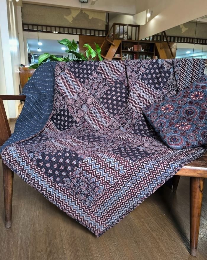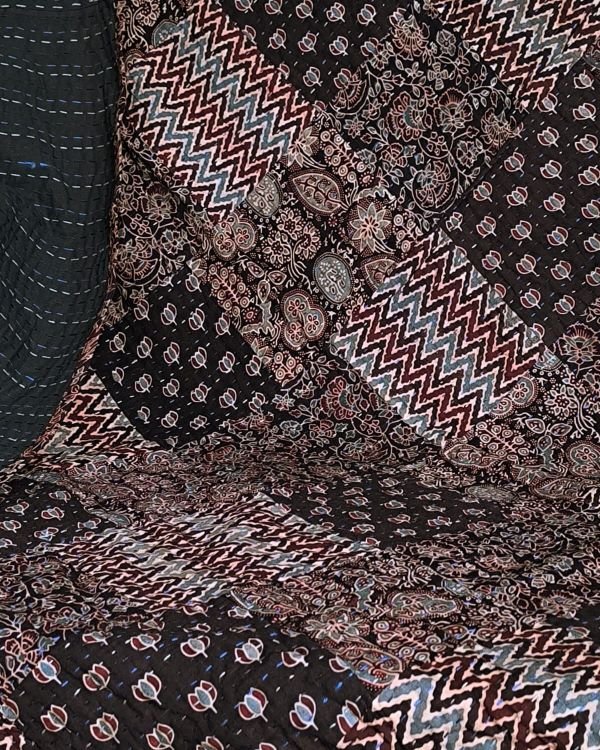 Single size Patchwork Two-Layer Ajrakh Quilt (Godhri). Can be used as a blanket, bedcover, or a sofa throw. Please note, there is no stuffing/batting inside.