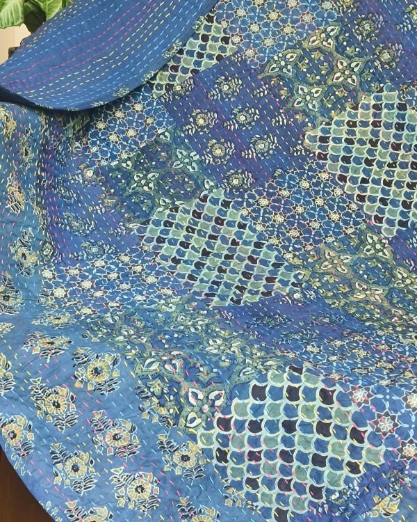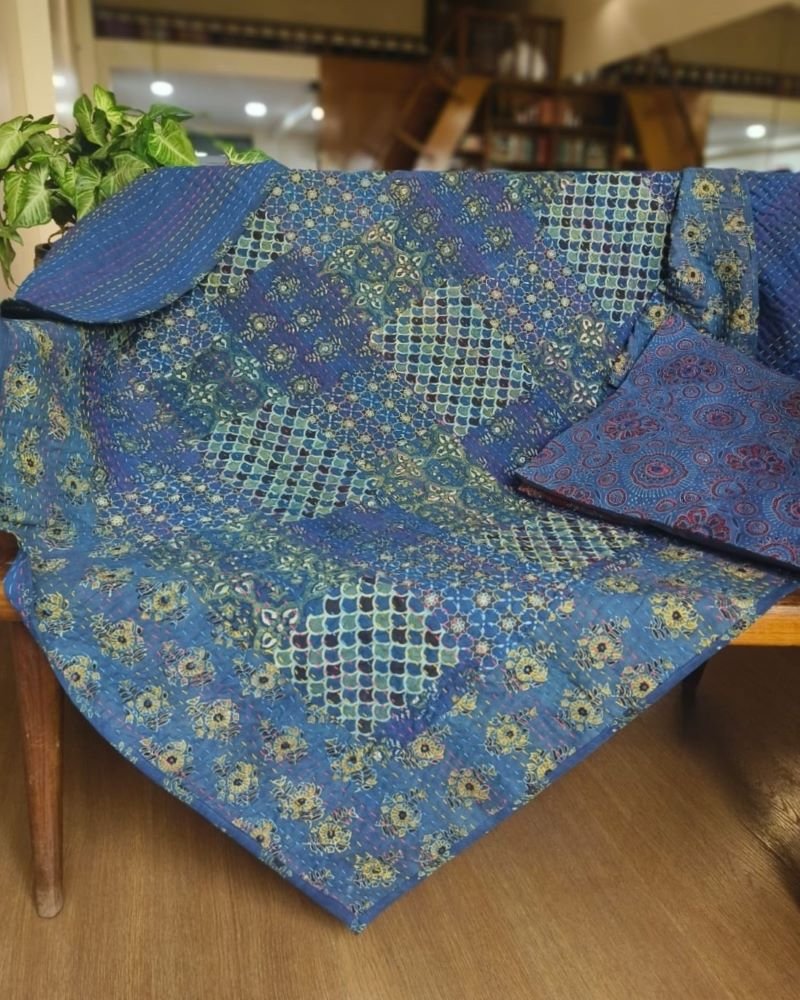Single size Patchwork Two-Layer Ajrakh Quilt (Godhri). Can be used as a blanket, bedcover, or a sofa throw. Please note, there is no stuffing/batting inside.