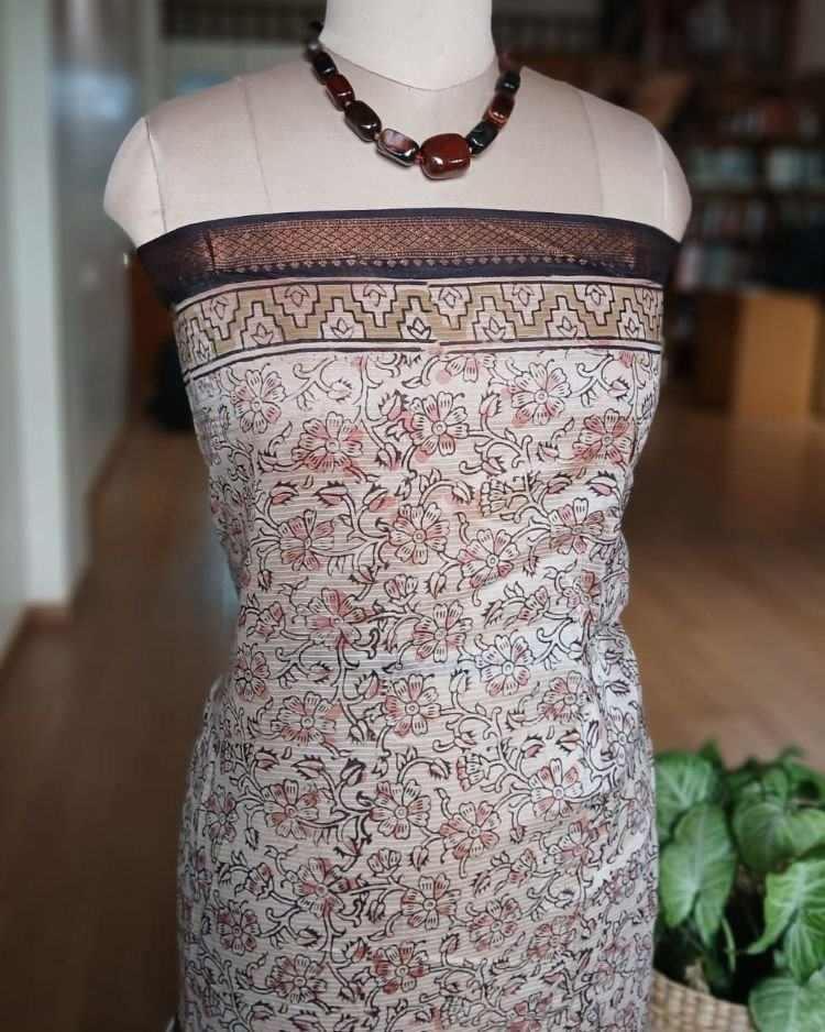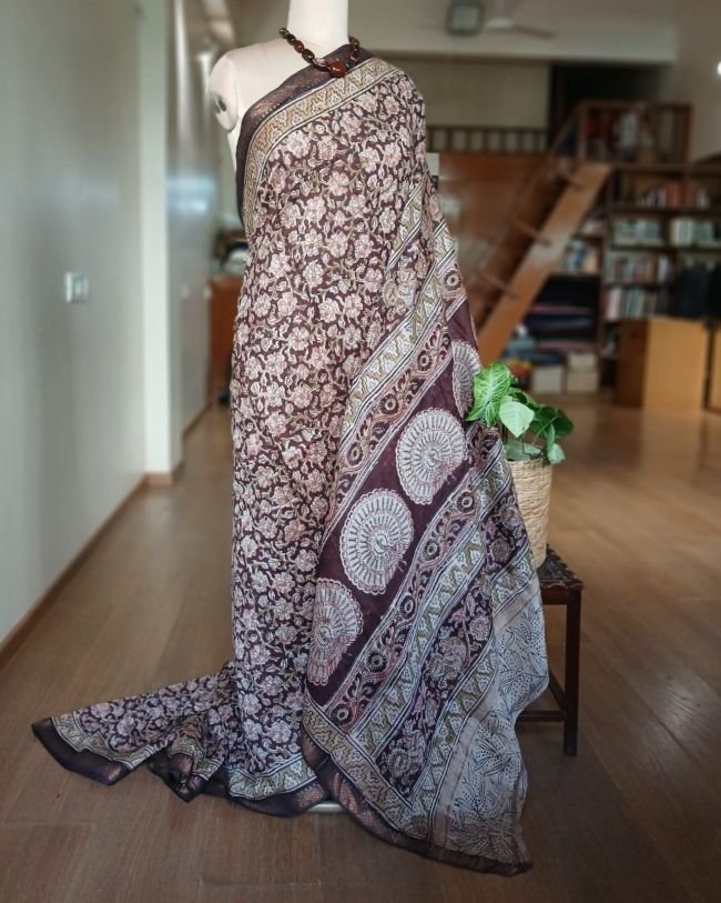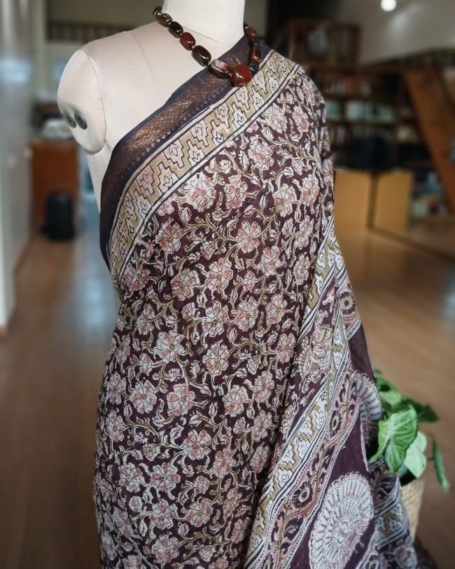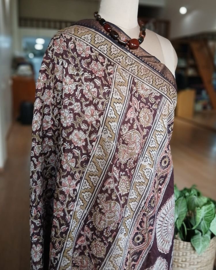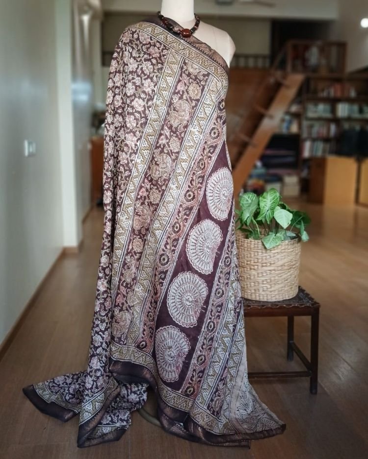 Pedana Silk-Cotton Kalamkari sarees, hand block printed in the Krishna District of Andhra Pradesh.