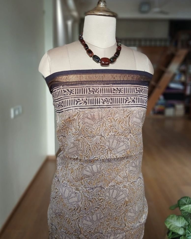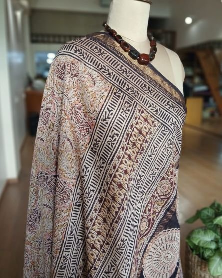 Pedana Silk-Cotton Kalamkari sarees, hand block printed in the Krishna District of Andhra Pradesh.