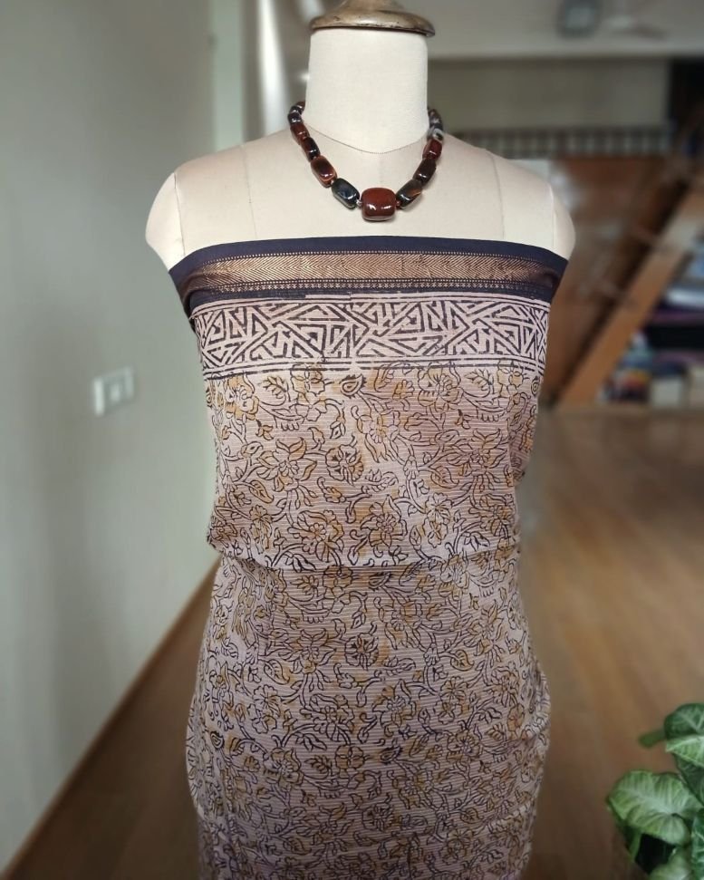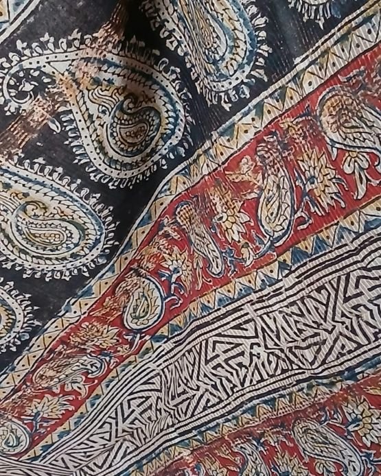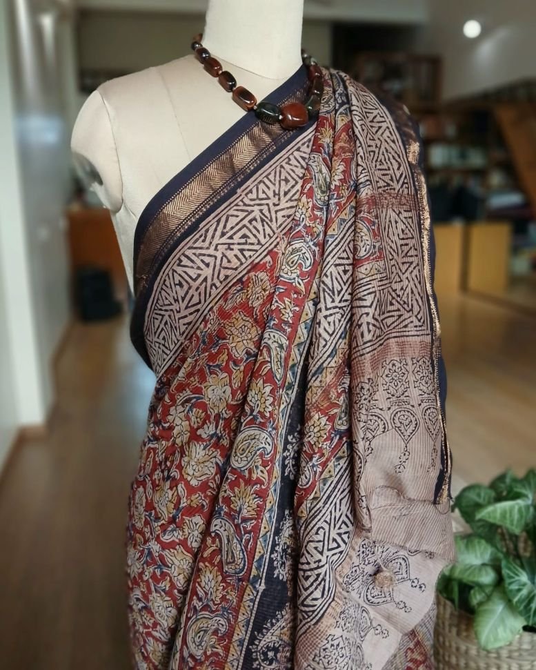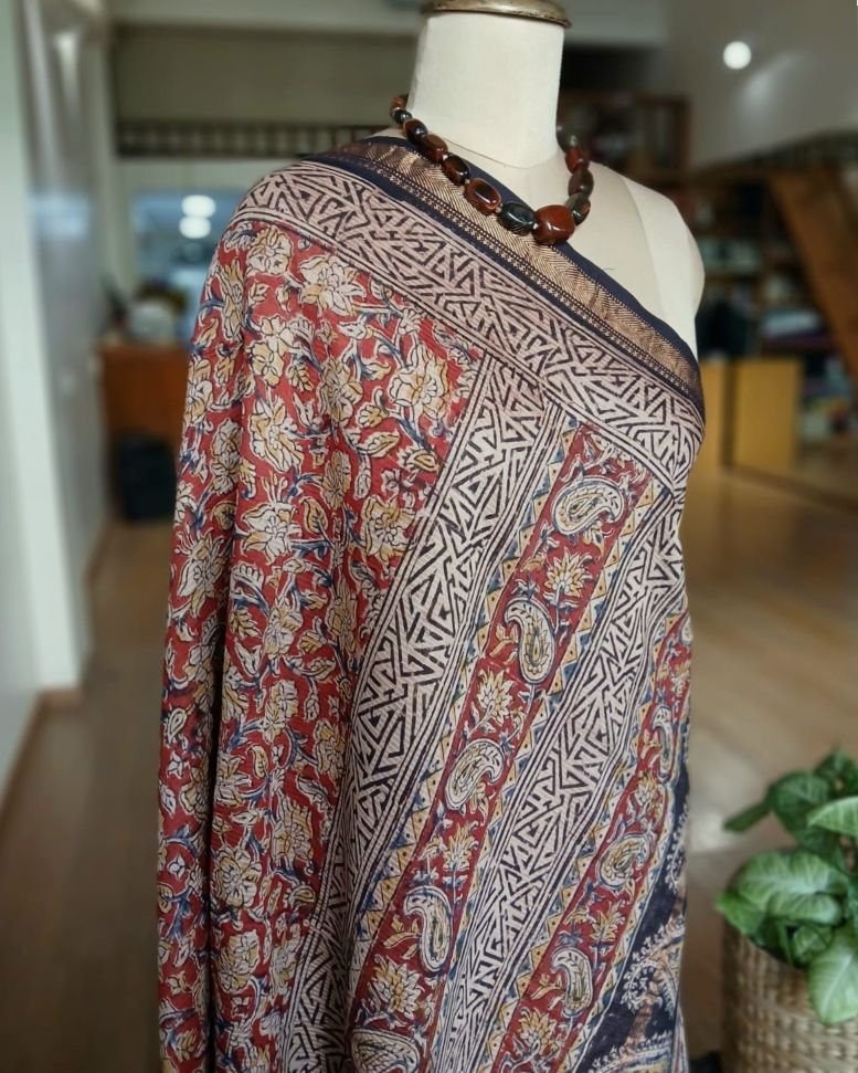 Pedana Silk-Cotton Kalamkari sarees, hand block printed in the Krishna District of Andhra Pradesh.