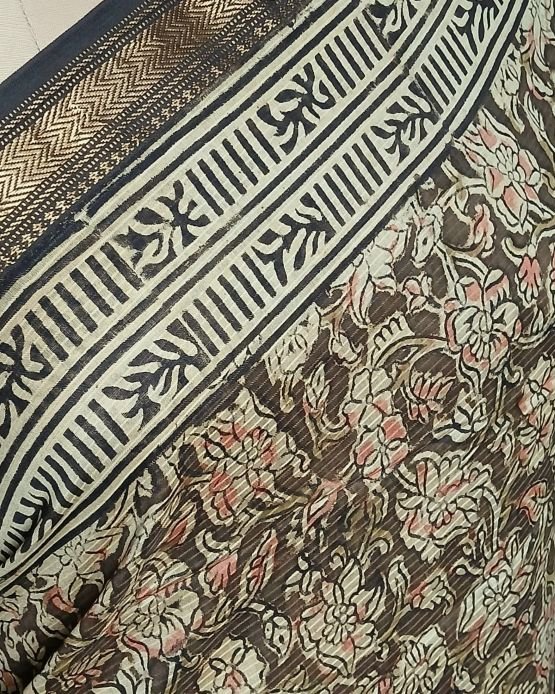 The saree is printed in natural dyes.The base saree is in Maheshwari silk-cotton and the fabric drapes beautifully.