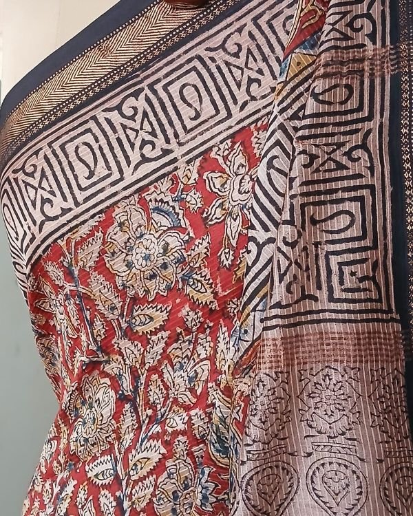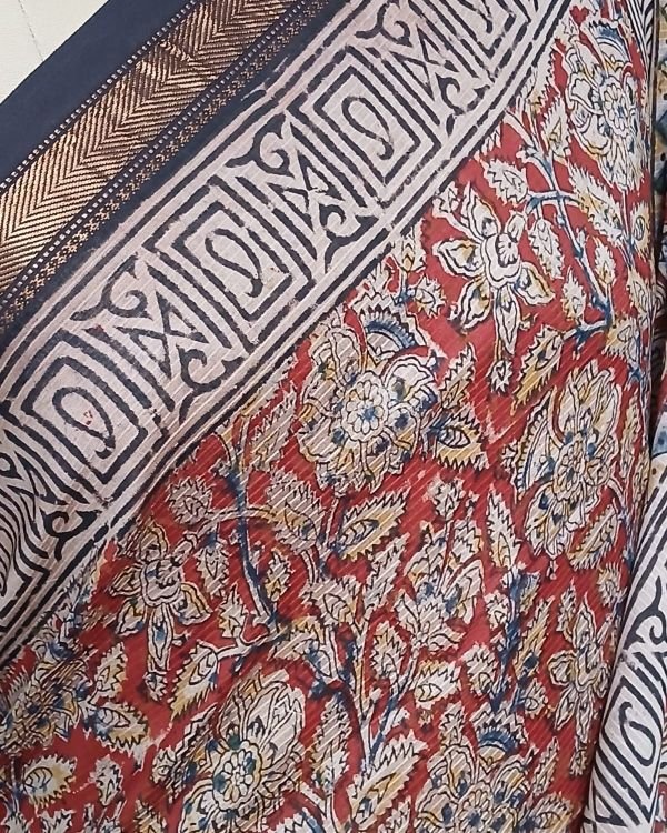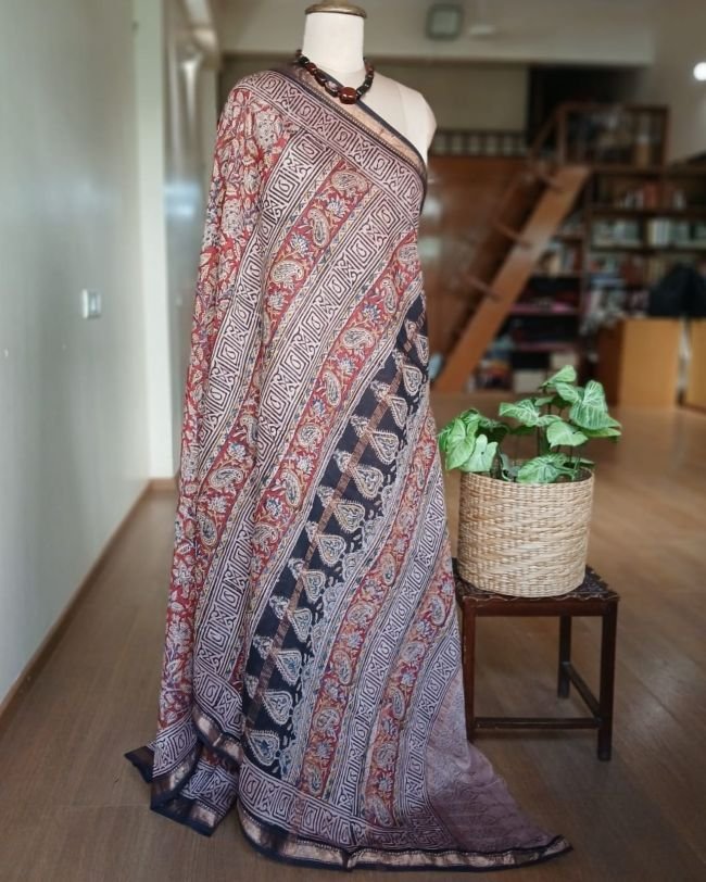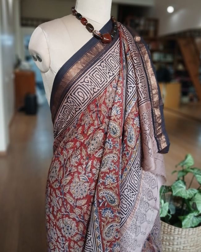 Pedana Silk-Cotton Kalamkari sarees, hand block printed in the Krishna District of Andhra Pradesh.