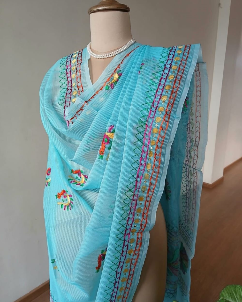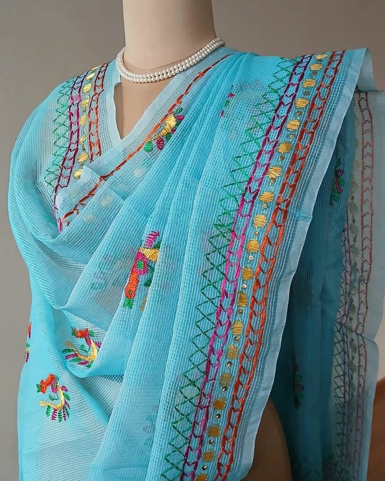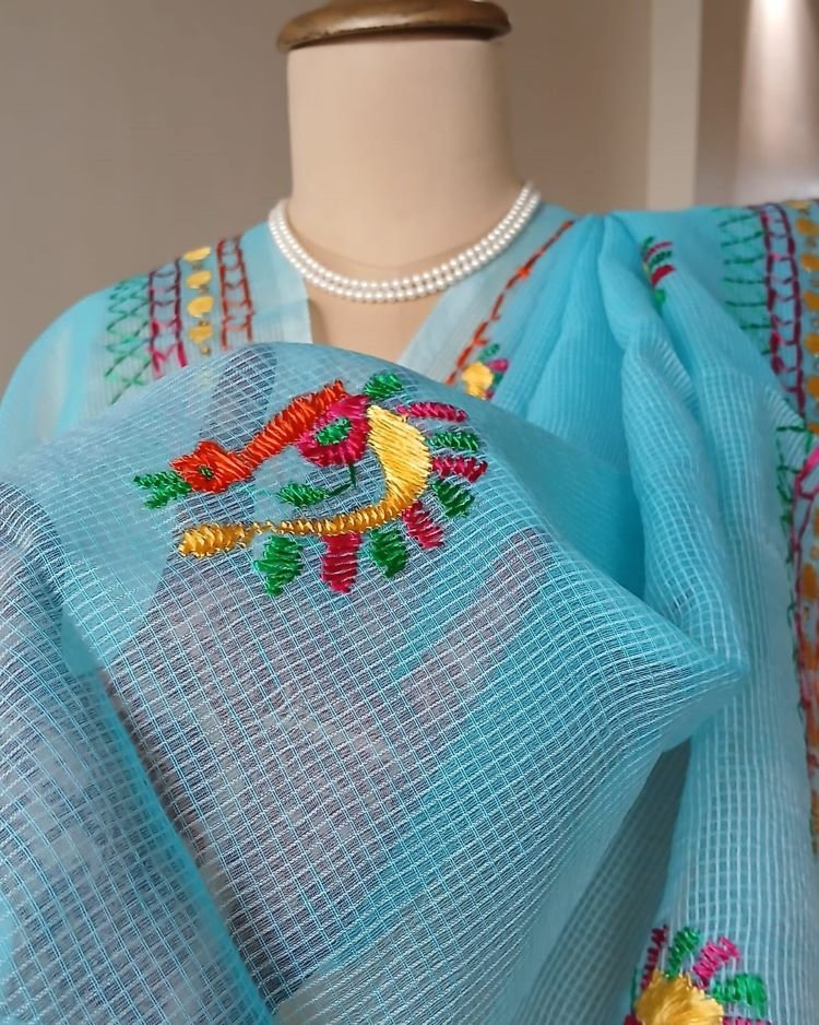The base fabric is cotton + art silk in a Kota Doria weave.