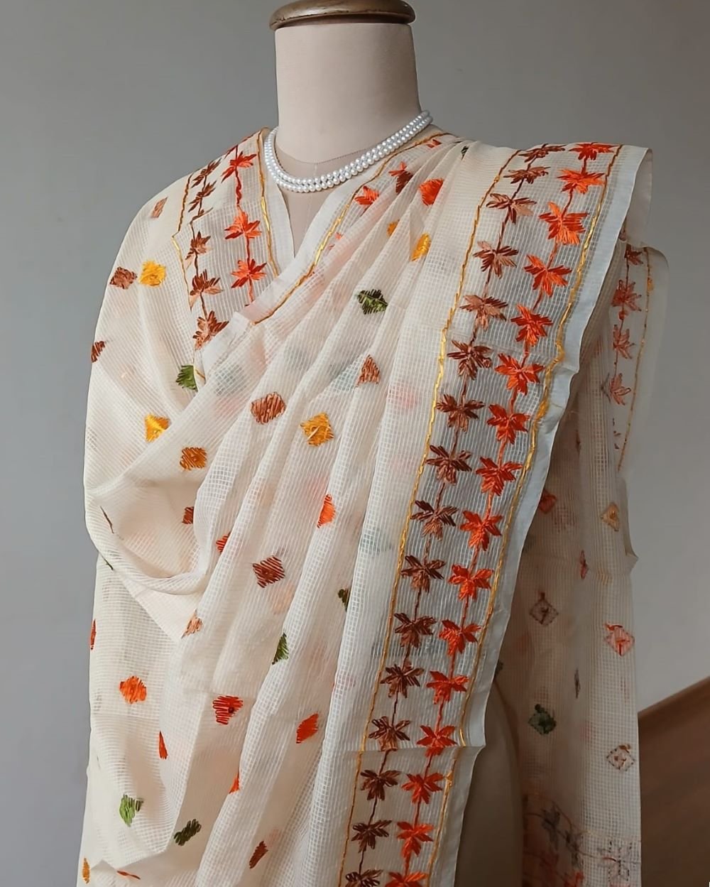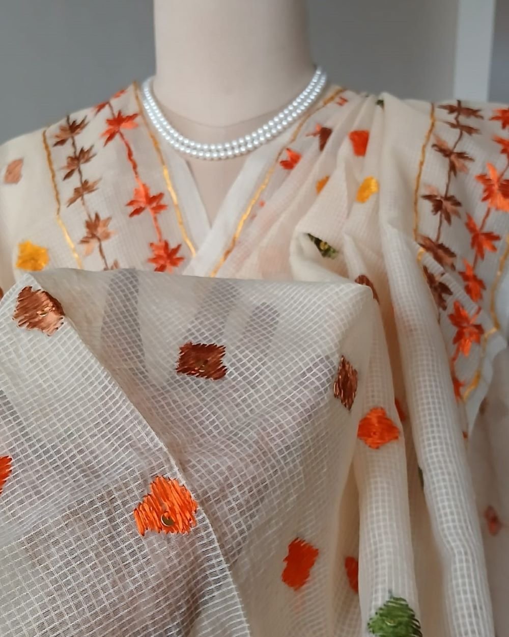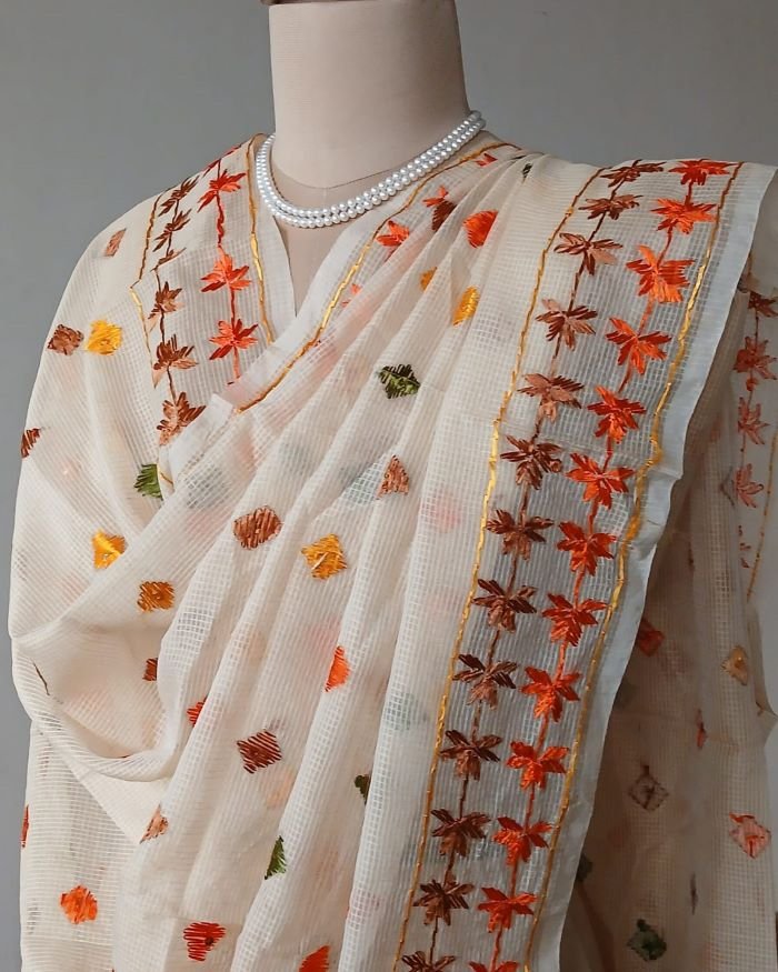 The base fabric is cotton + art silk in a Kota Doria weave.