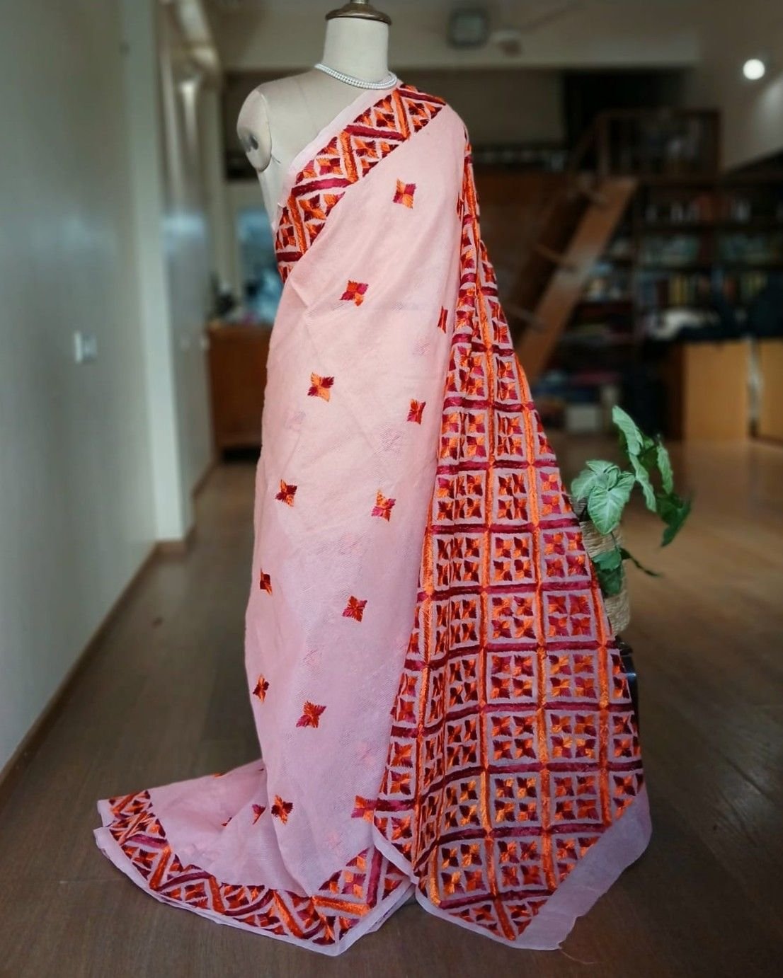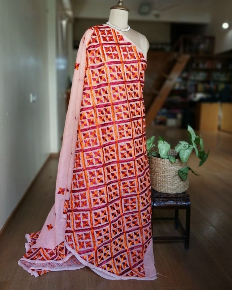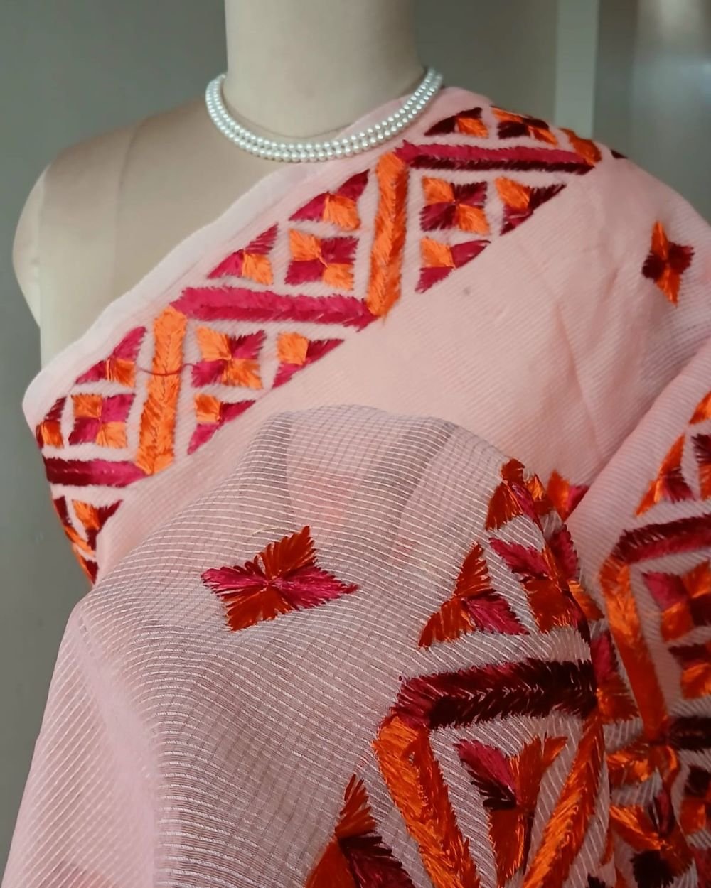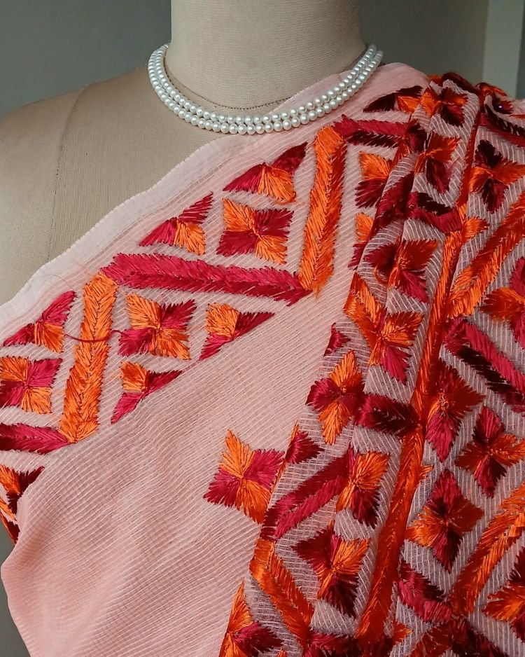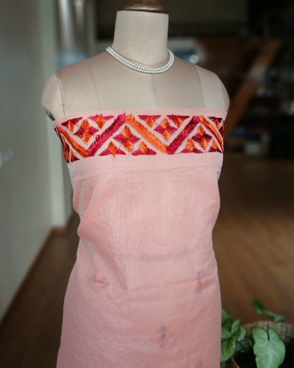 The base fabric is cotton + art silk in a Kota Doria weave. The hand embroidery is done with silk floss thread.