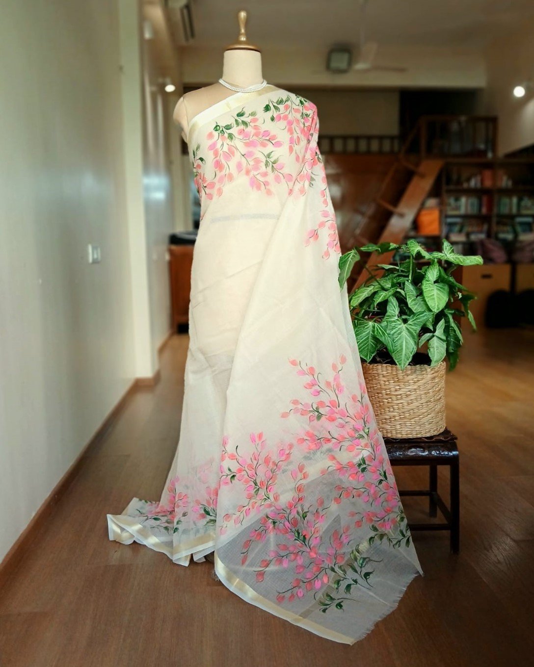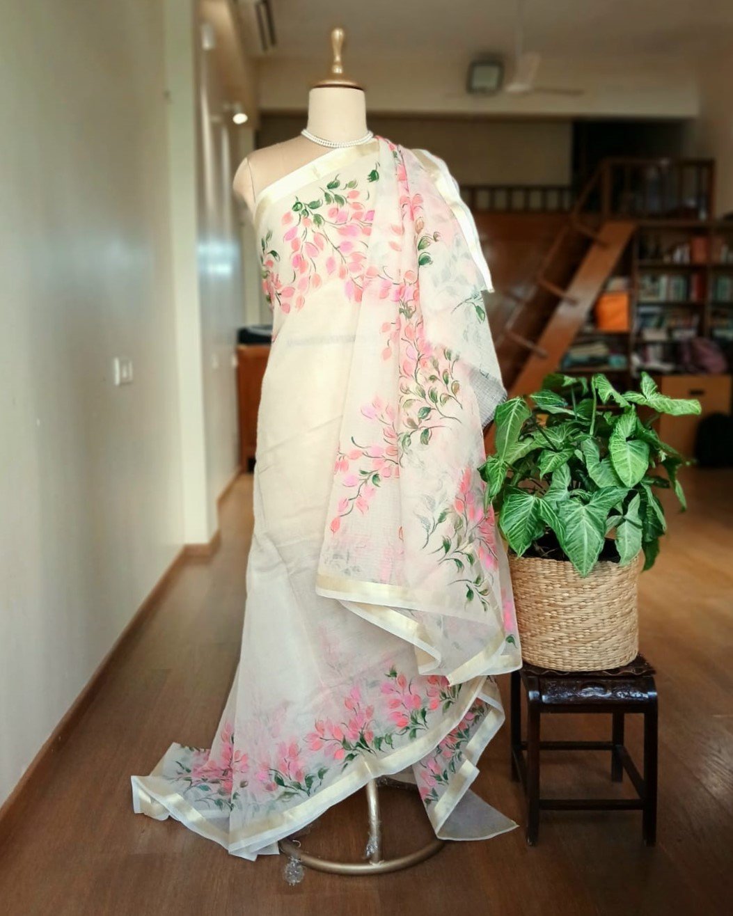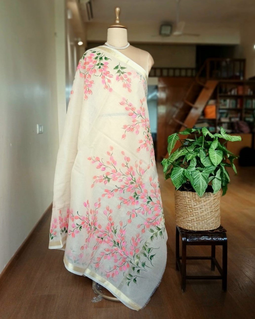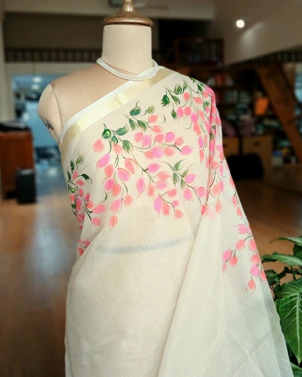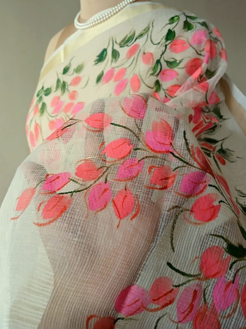 Hand-painted saree in pale cream colour, with pretty hanging vines in pink and peach. The base material is Cotton Kota Doria. Each brush-stroke is done by hand, using fabric paint. The colours do not bleed.