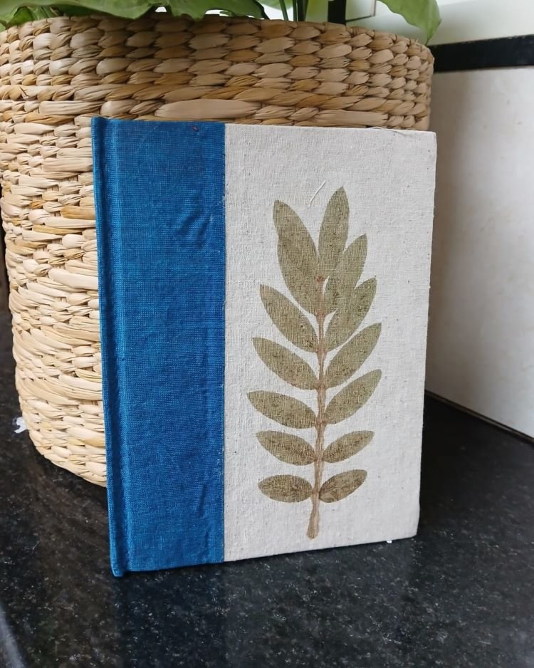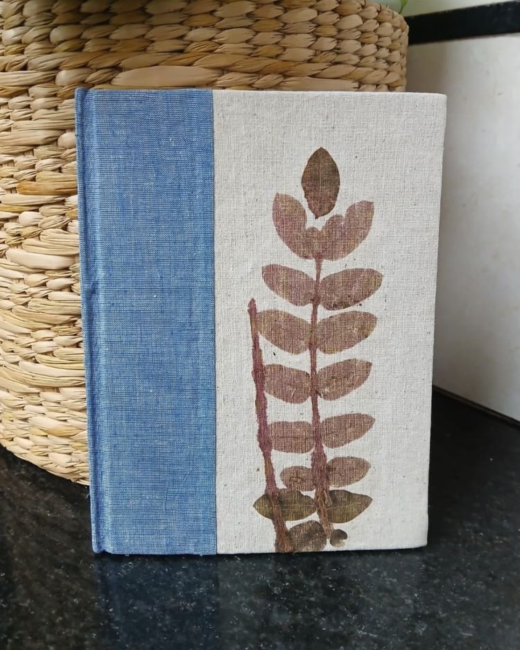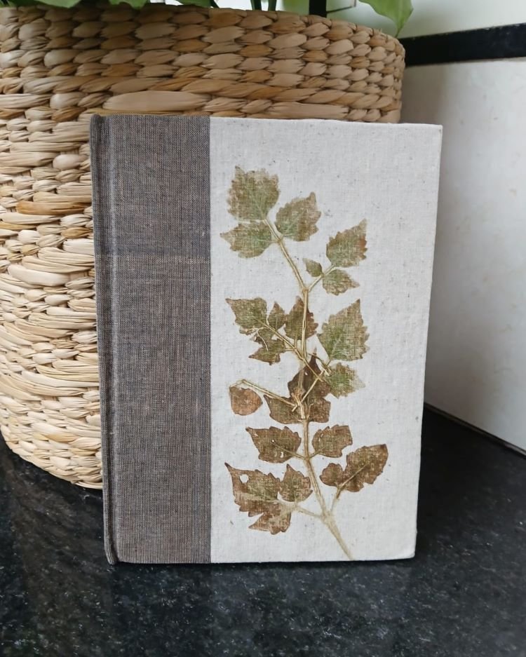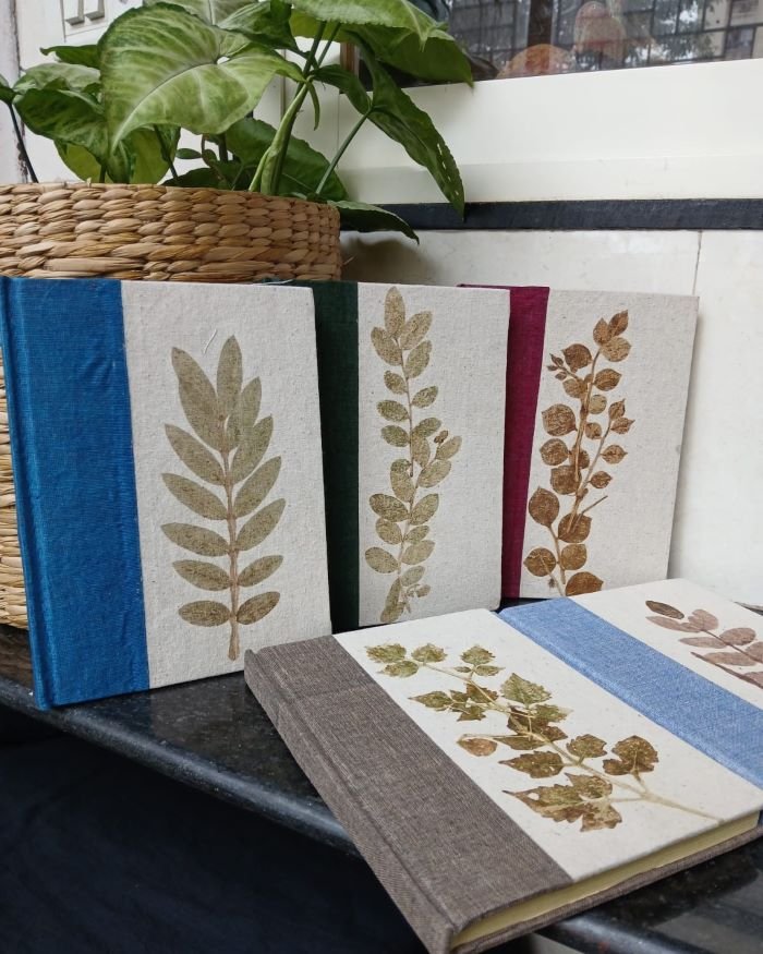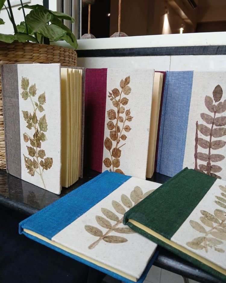 Pretty Leaf Notebooks made by heat pressing natural leaves onto markin cotton (unbleached cotton).