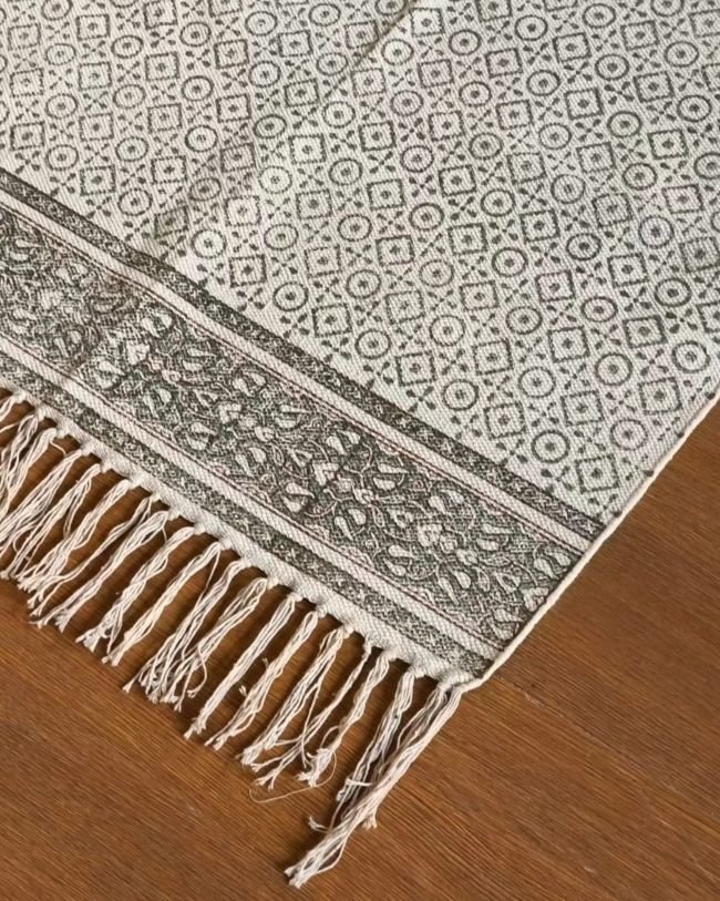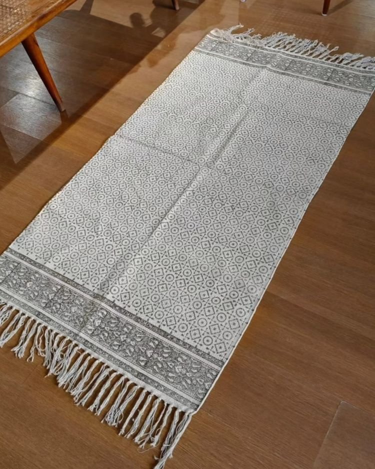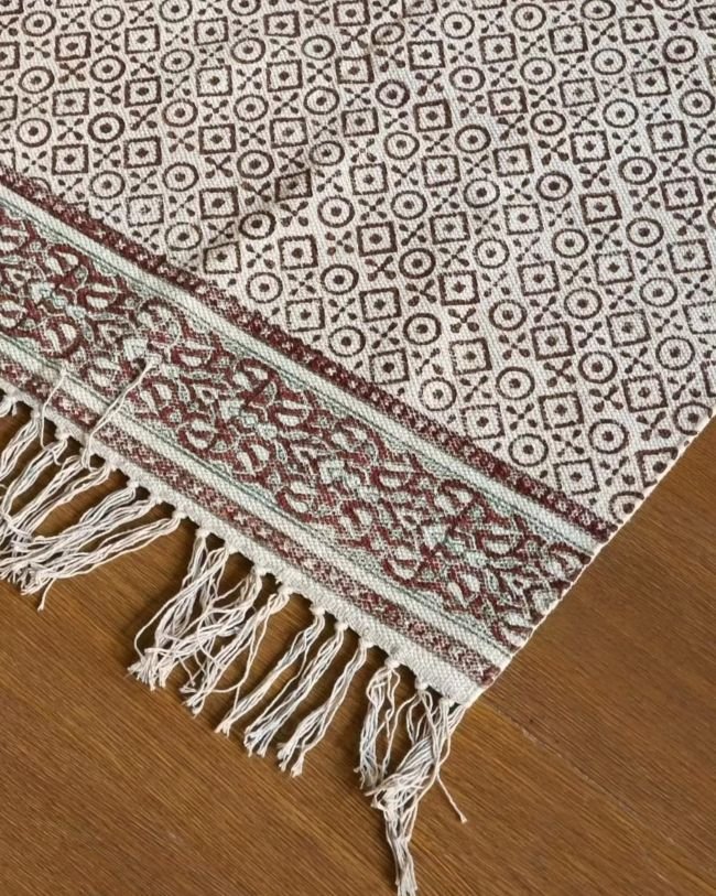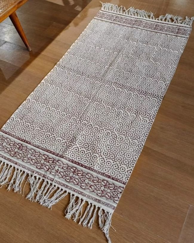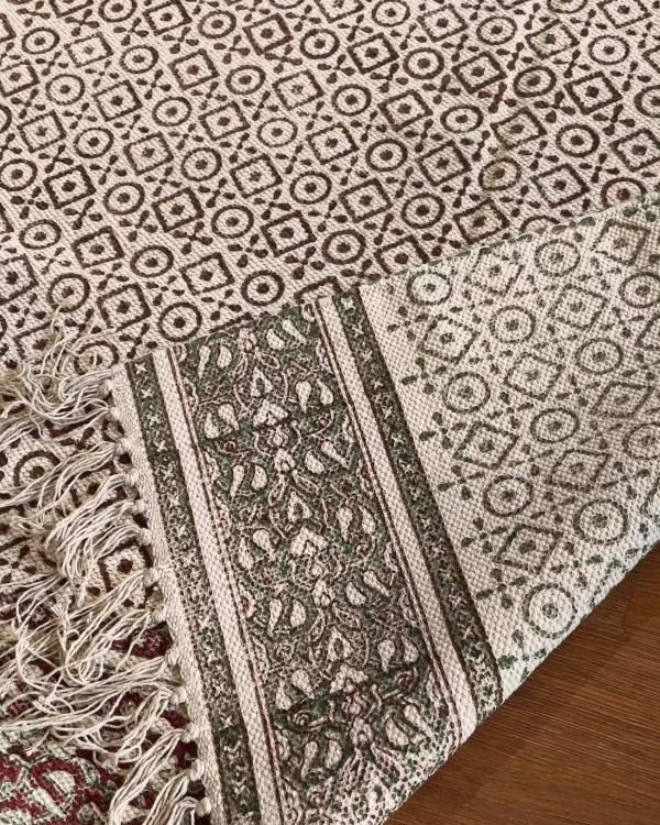 Reversible Sanganeri dhurrie in cotton, handblock printed on both sides.