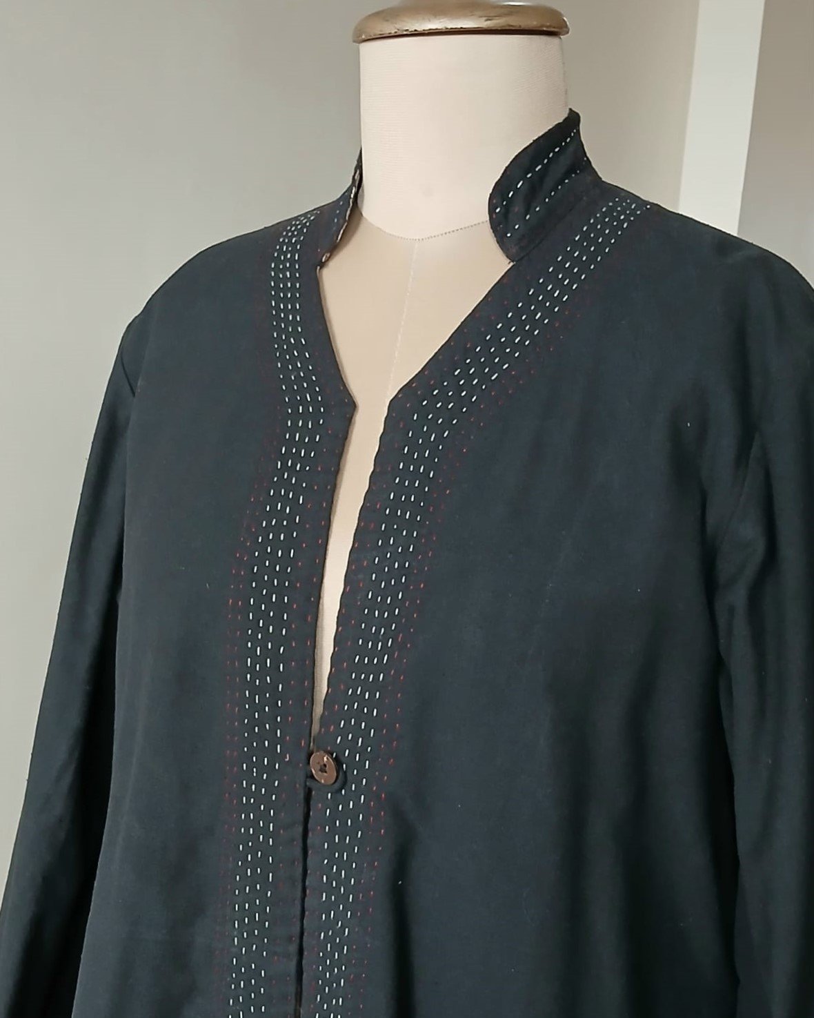 Reversible Cotton Dabu Handblock Print Jacket made by a non-profit in Rajasthan. Two pockets with running stitches detailing. Wooden button with loop closure. Running stitches on jacket collar and edges.