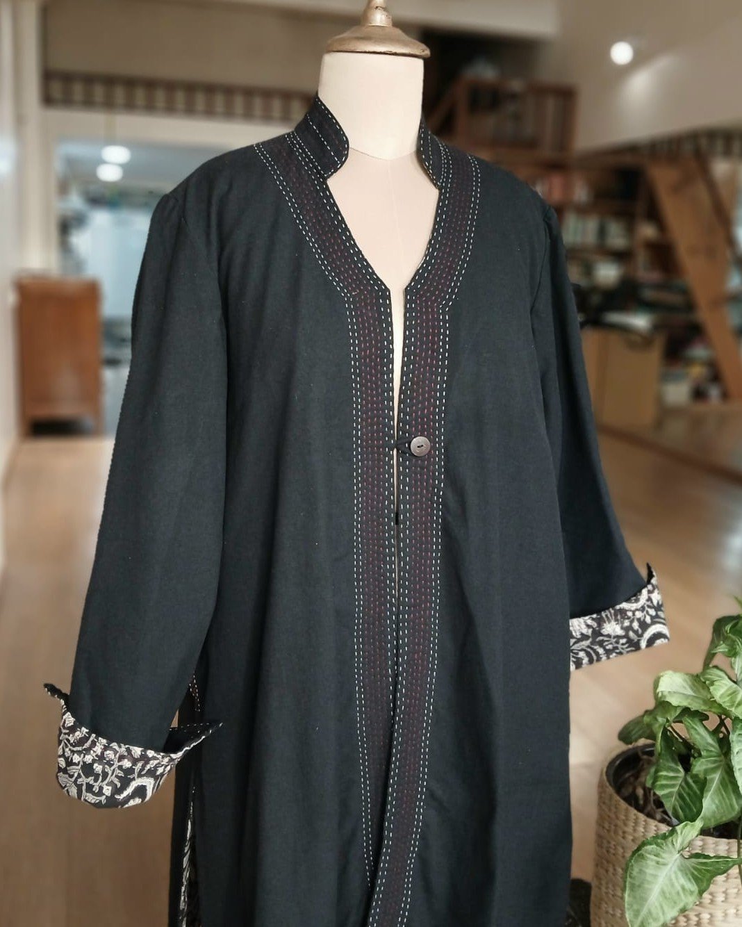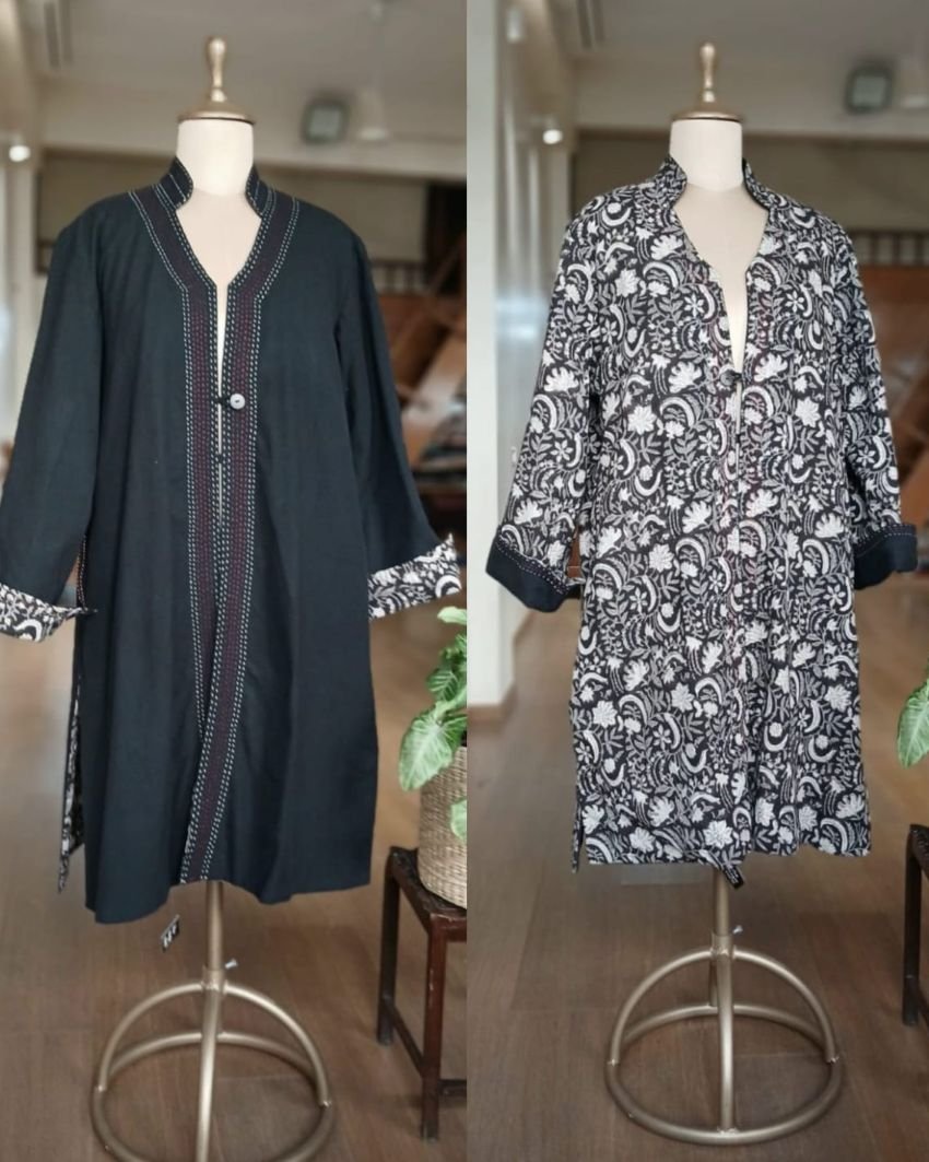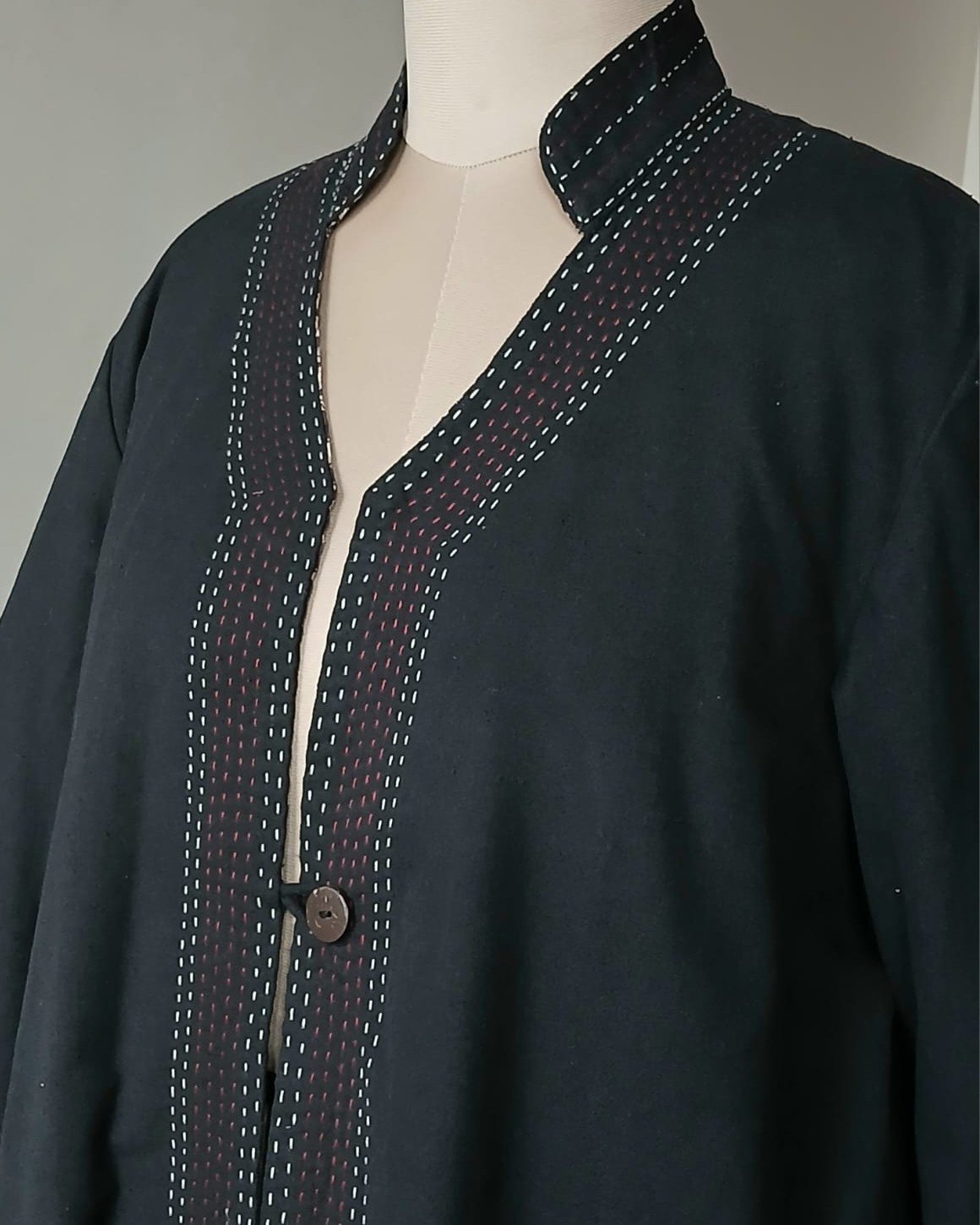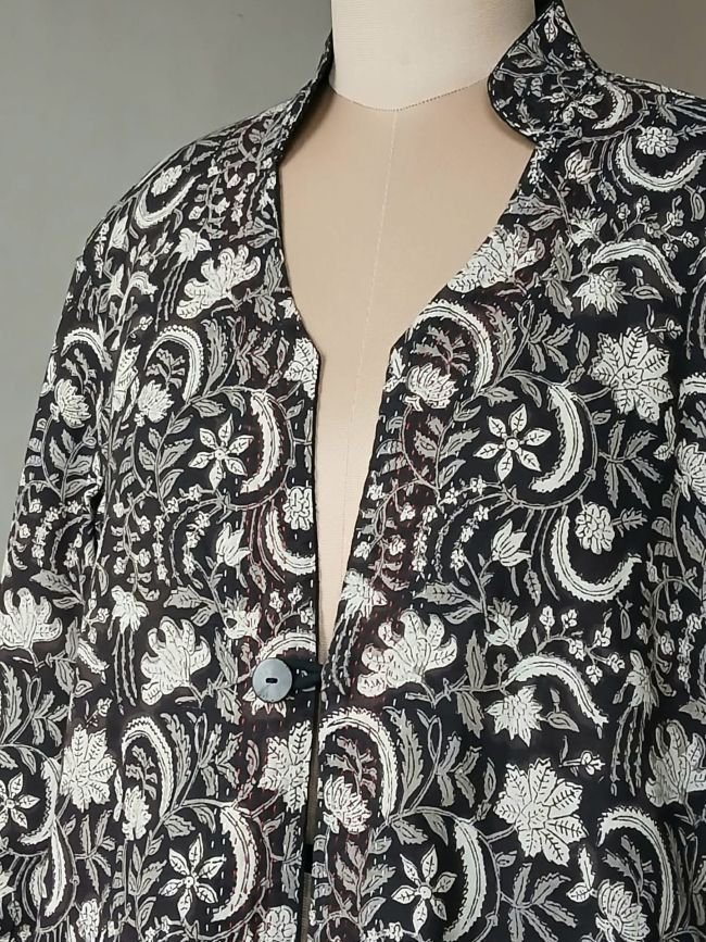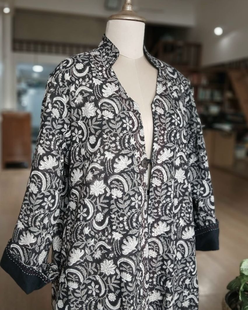 Reversible Cotton Dabu Handblock Print Jacket made by a non-profit in Rajasthan. Two pockets with running stitches detailing. Wooden button with loop closure. Running stitches on jacket collar and edges.