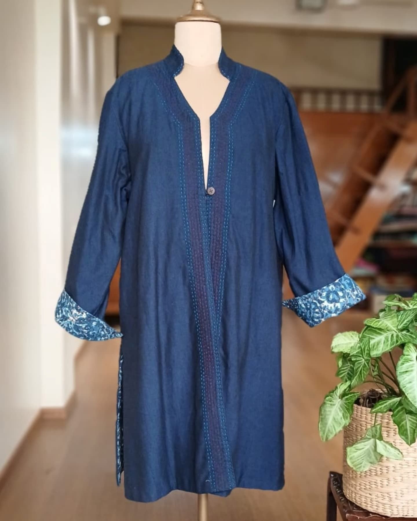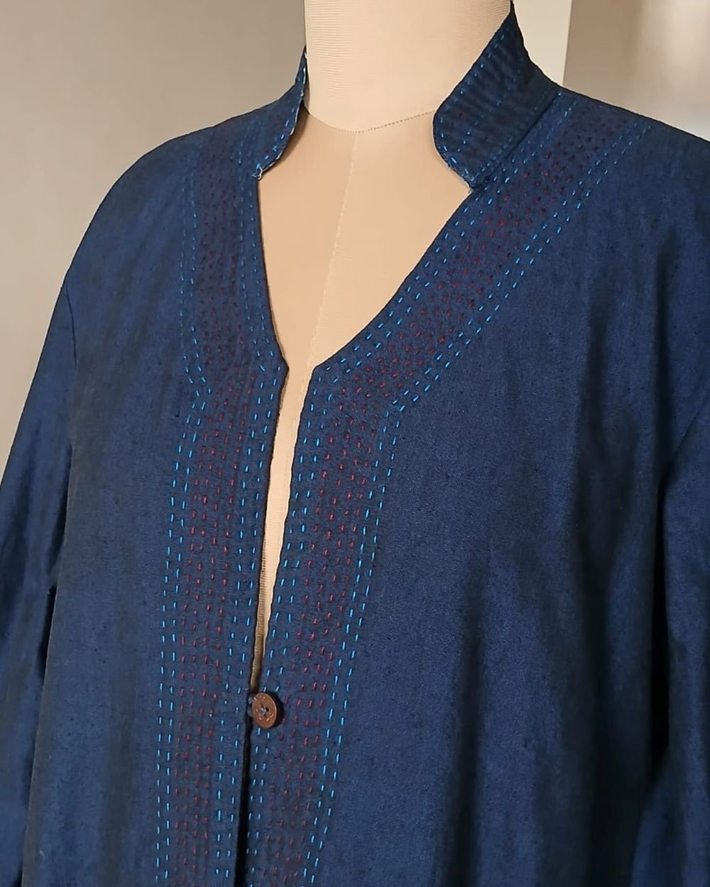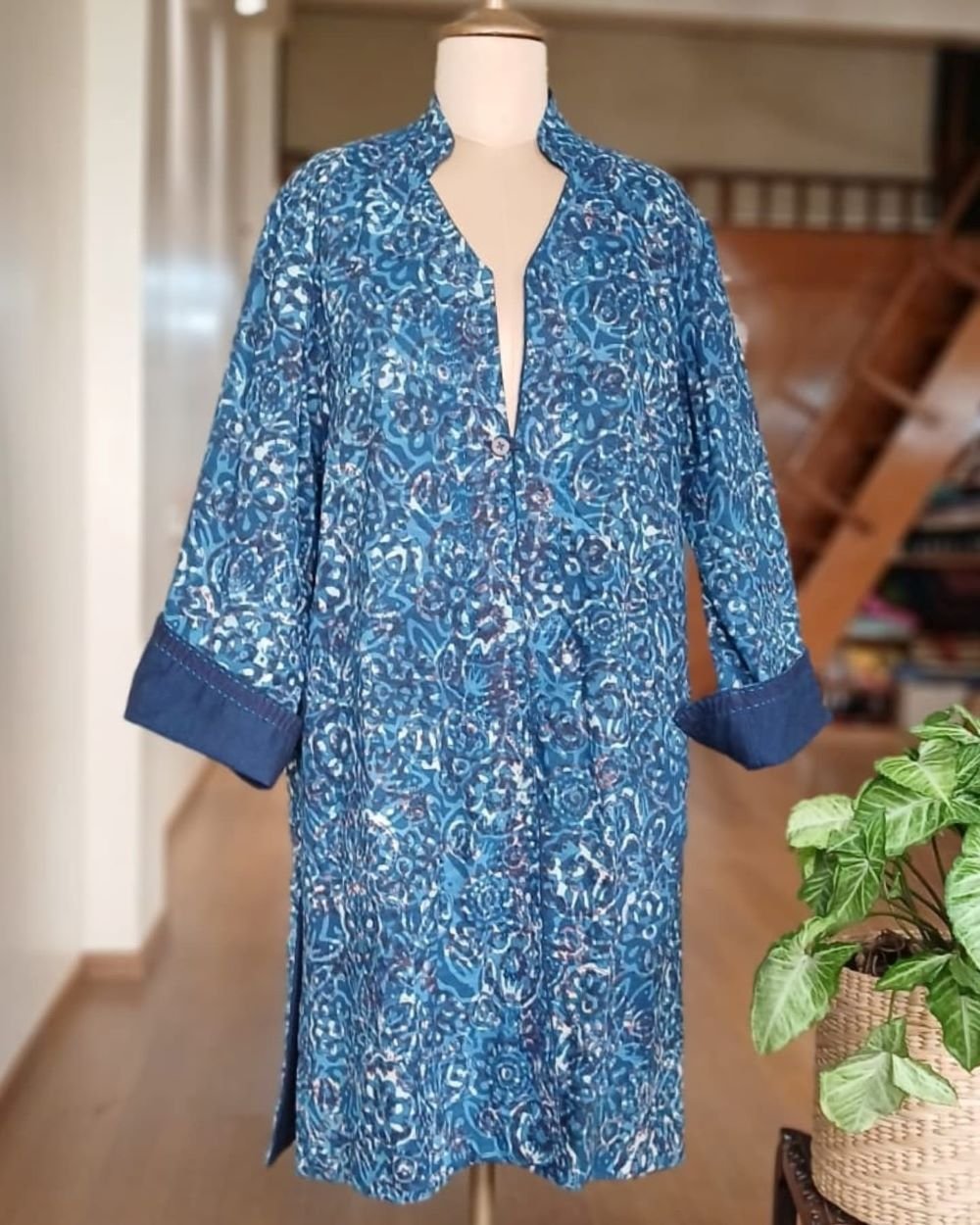 Reversible Cotton Dabu Handblock Print Jacket made by a non-profit in Rajasthan. Two pockets with running stitches detailing. Wooden button with loop closure. Running stitches on jacket collar and edges.