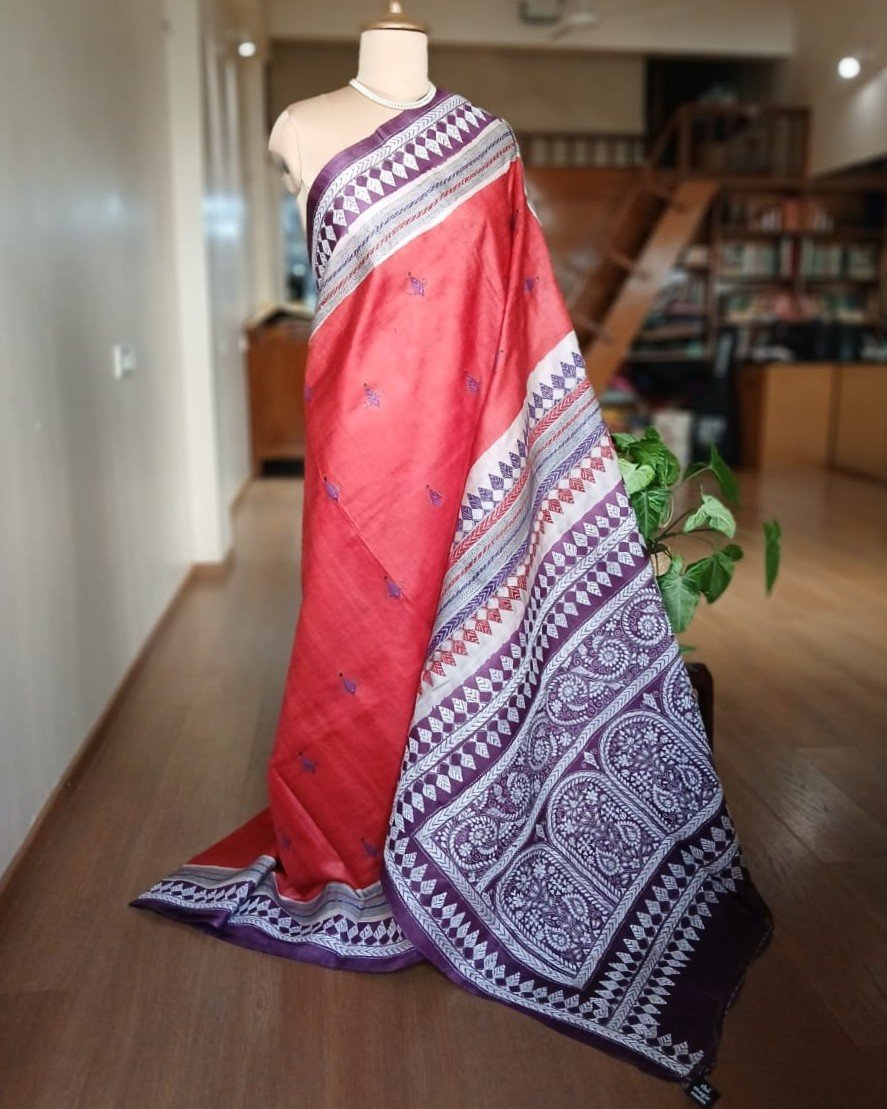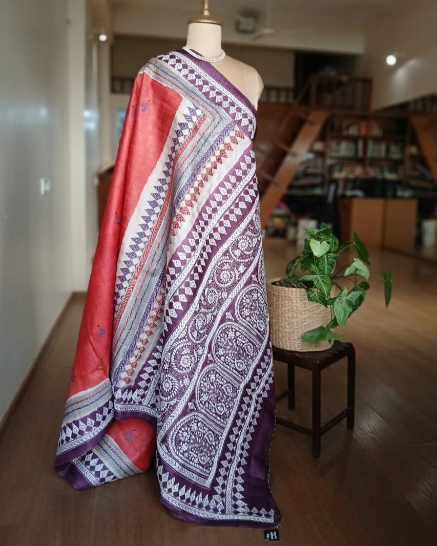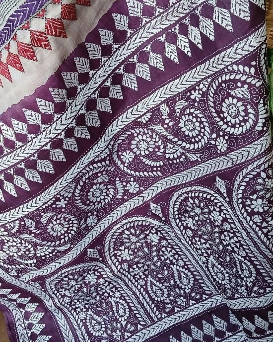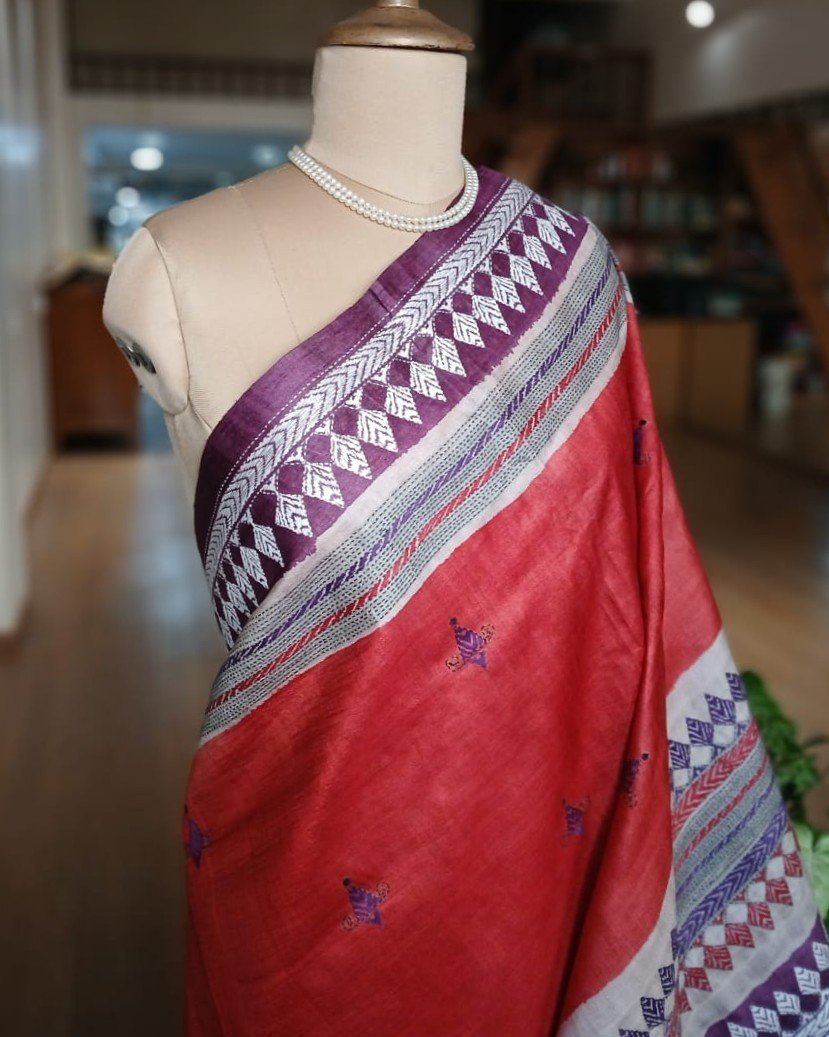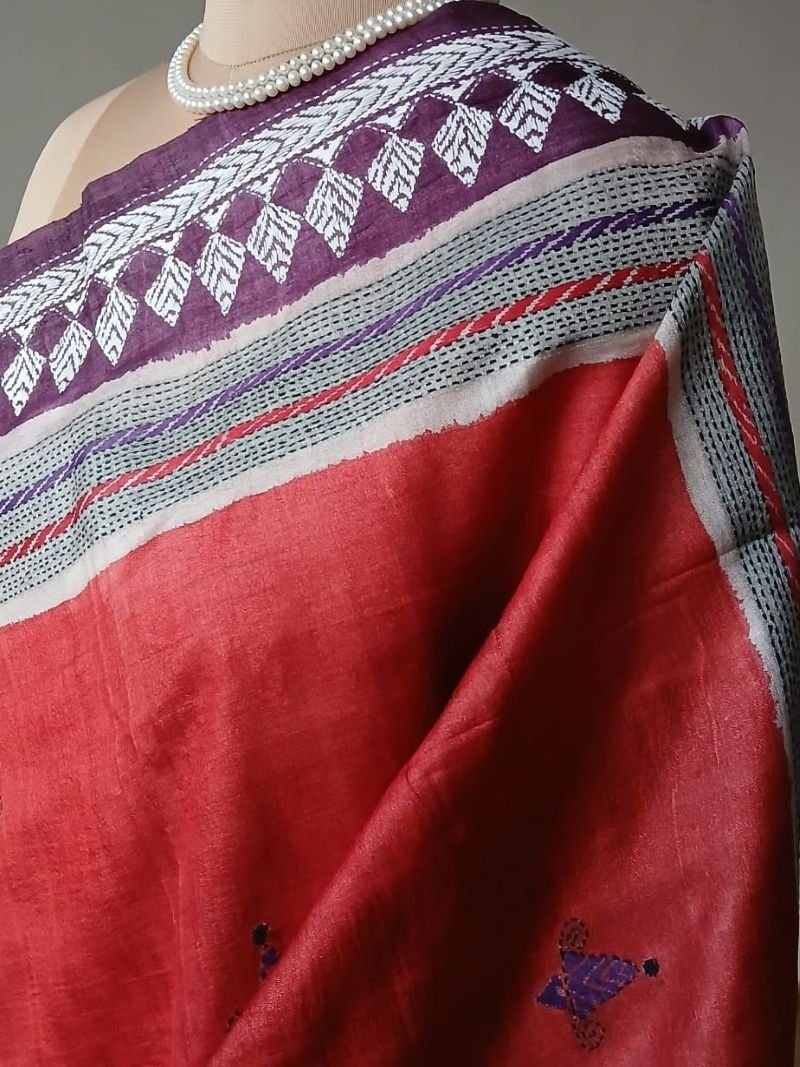 Santiniketan Kantha on Tussar Silk in red and jamun with beautiful floral arcade motifs in the palla.