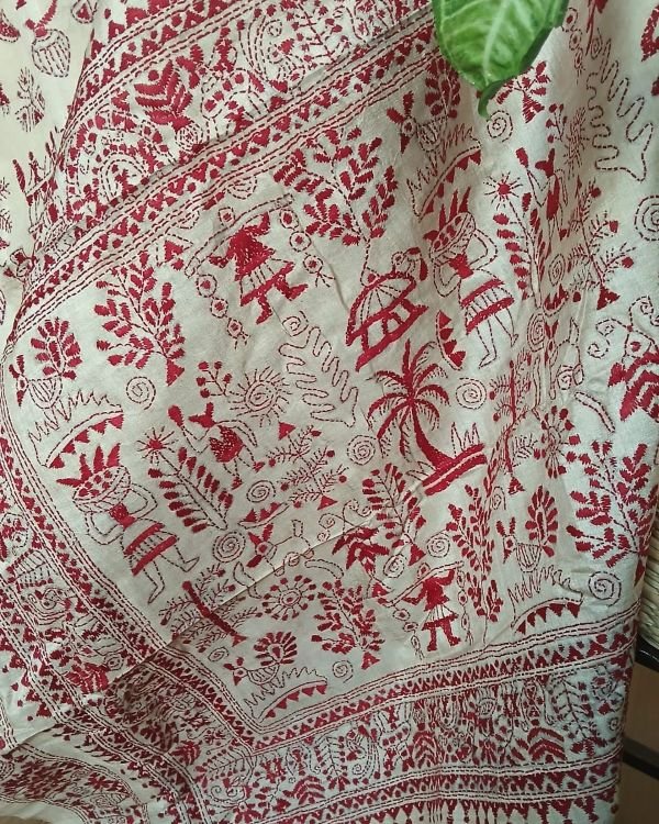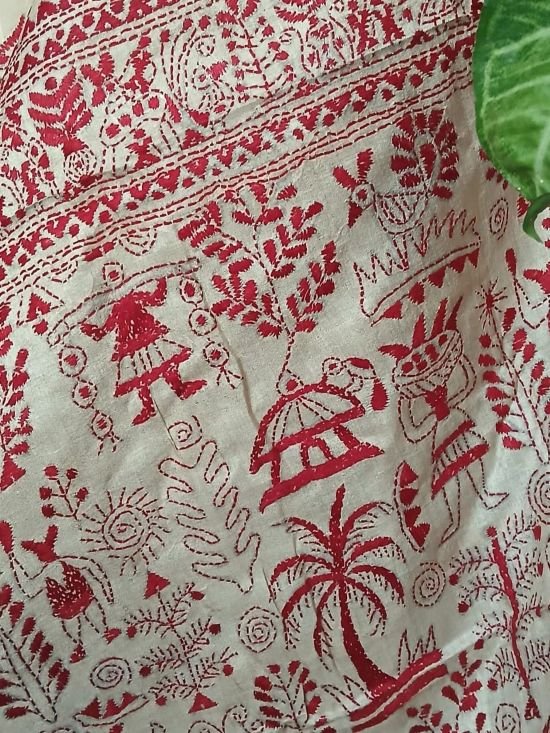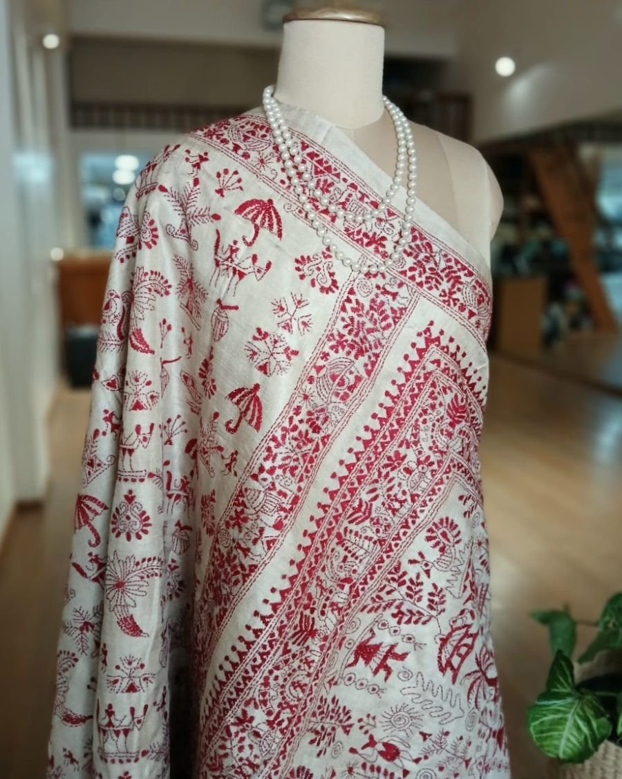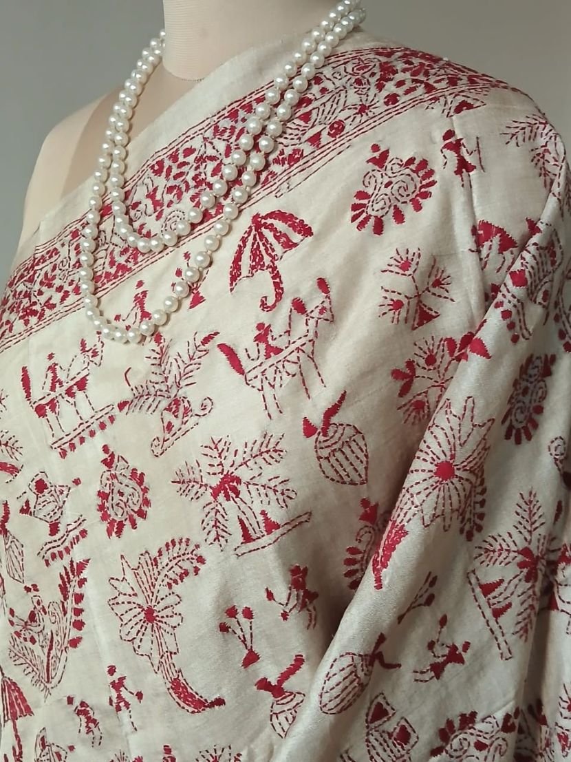 High quality Santiniketan Kantha Embroidery on soft flowing Tussar Silk.