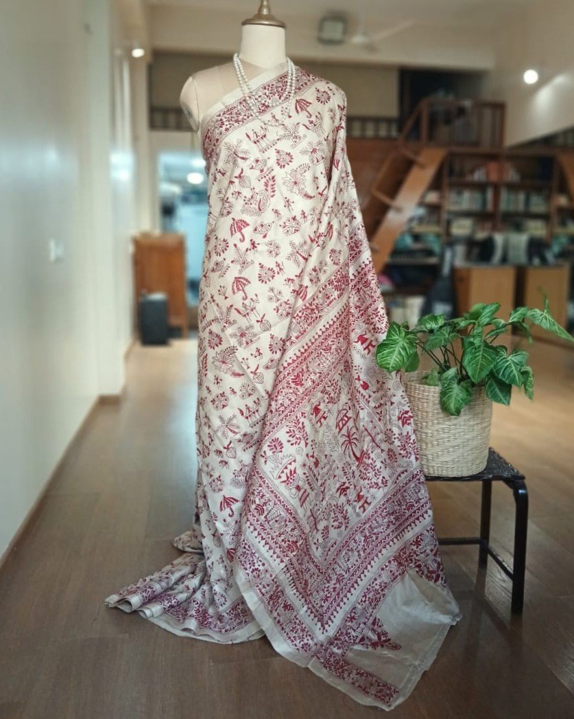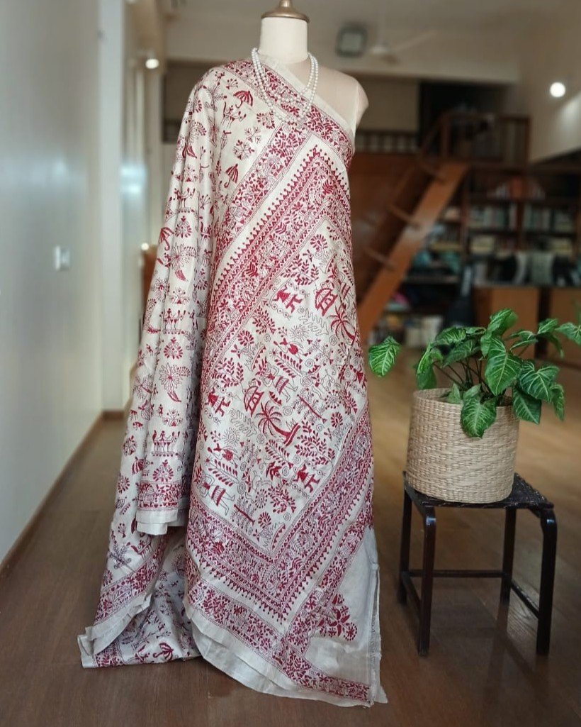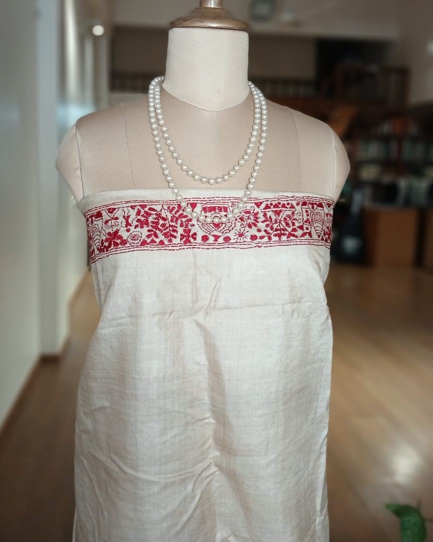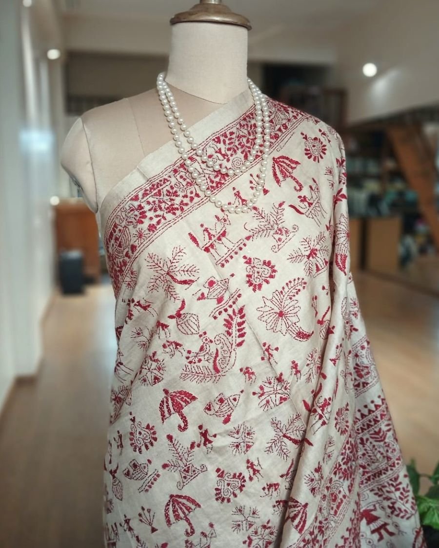 High quality Santiniketan Kantha Embroidery on soft flowing Tussar Silk.