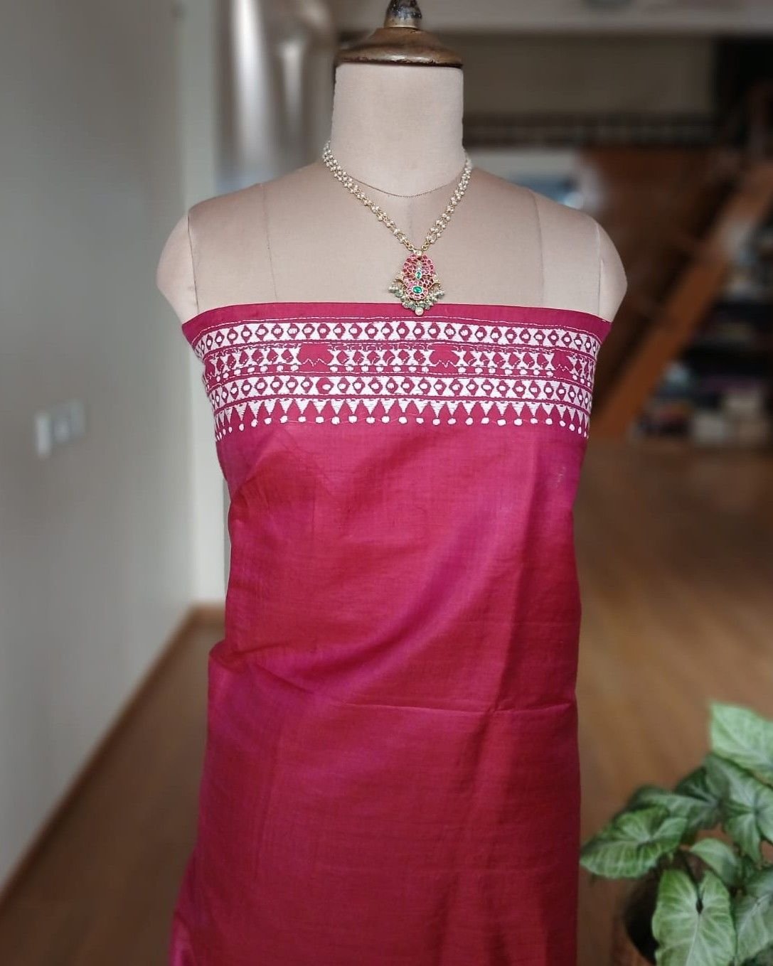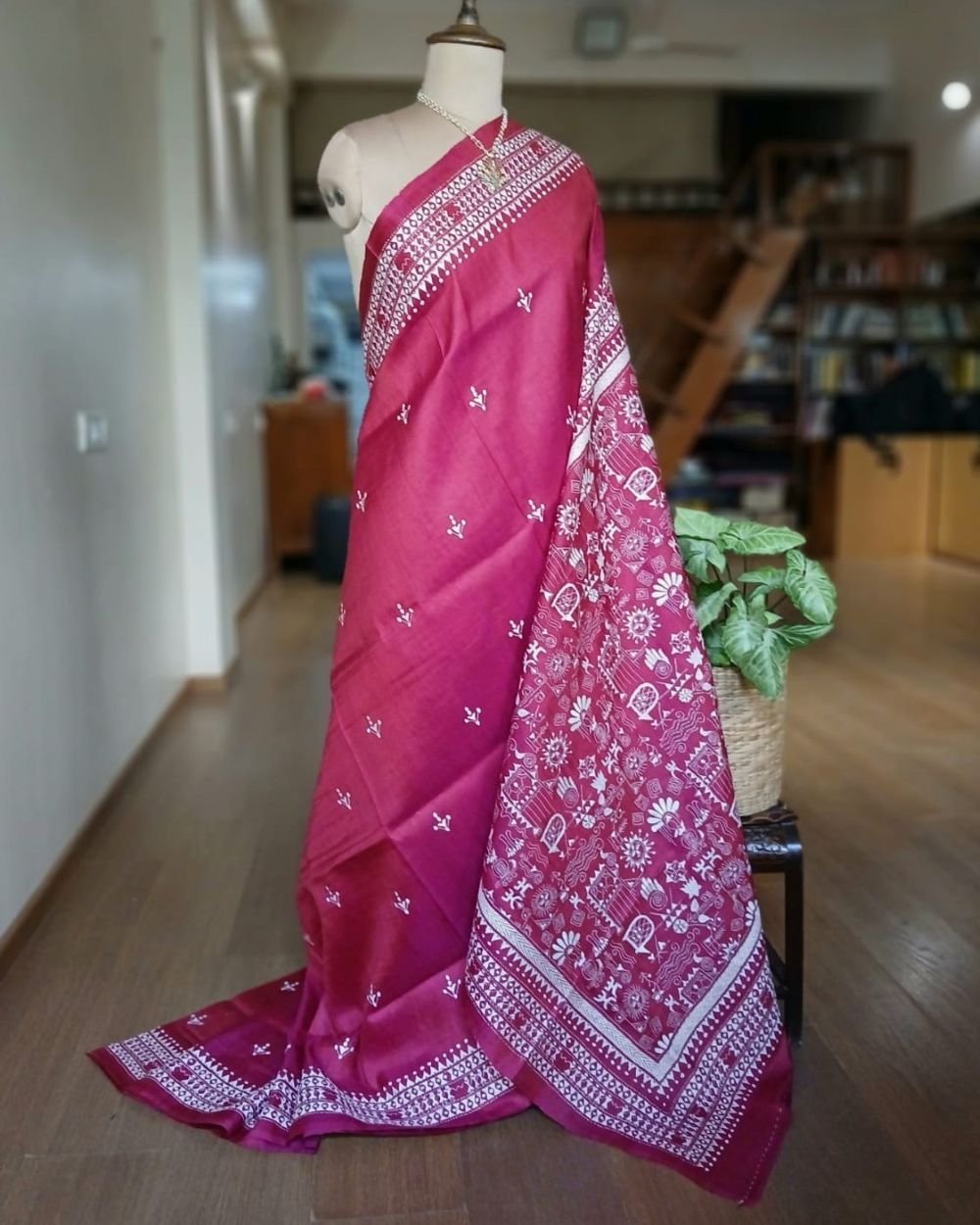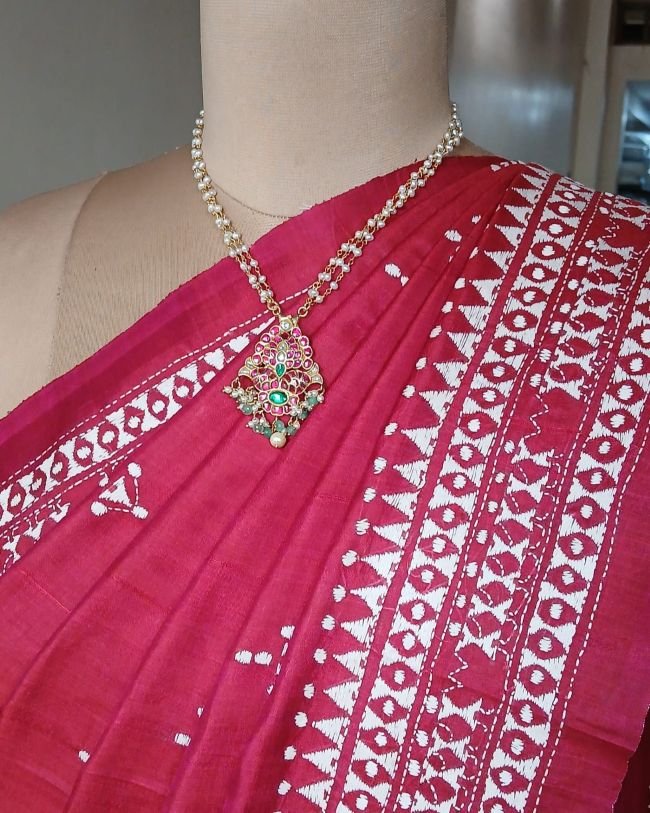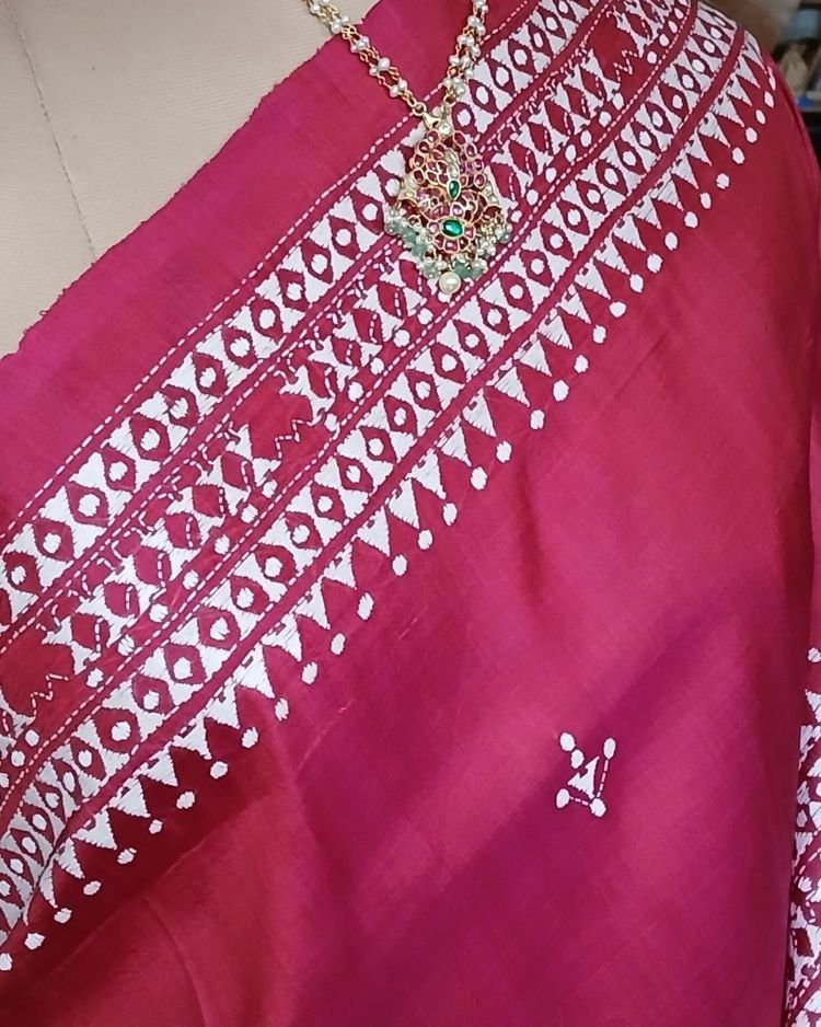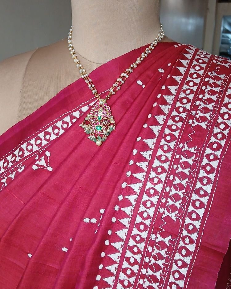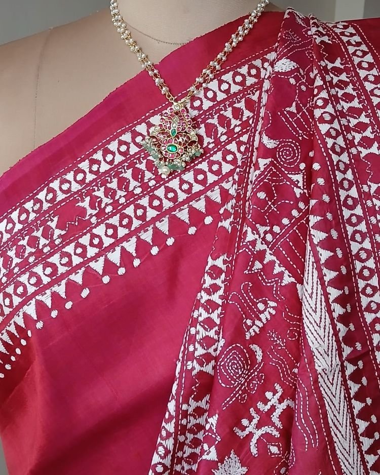 Hand embroidered Santiniketan kantha saree in pure Bisnupuri silk.