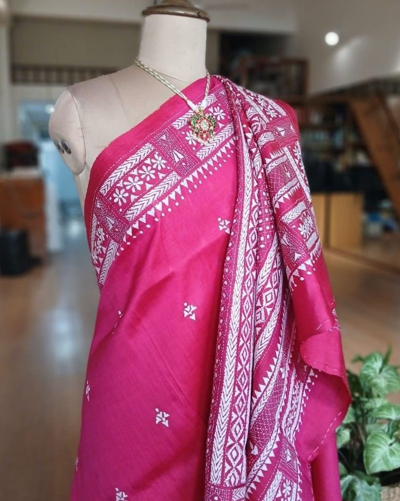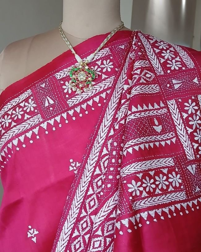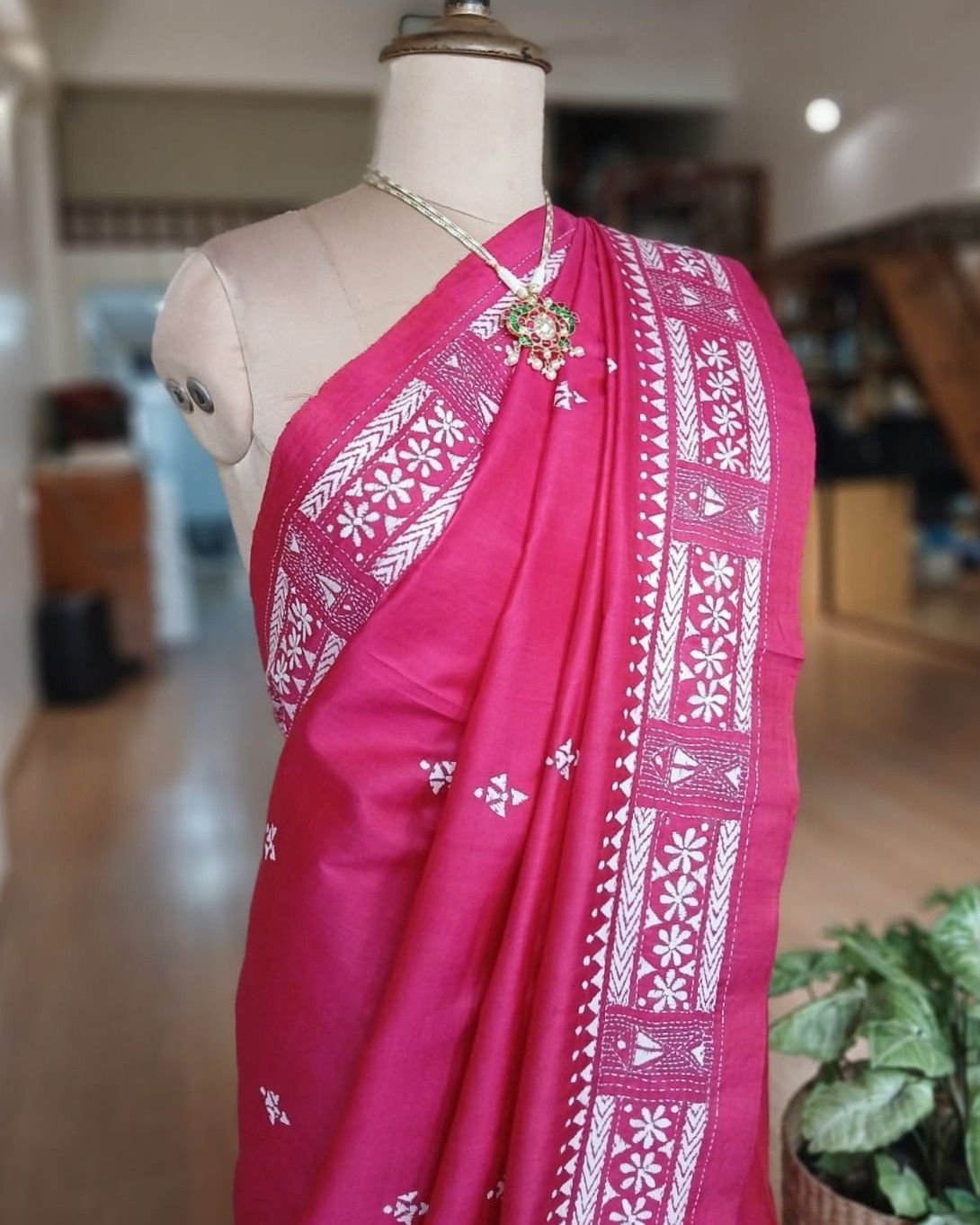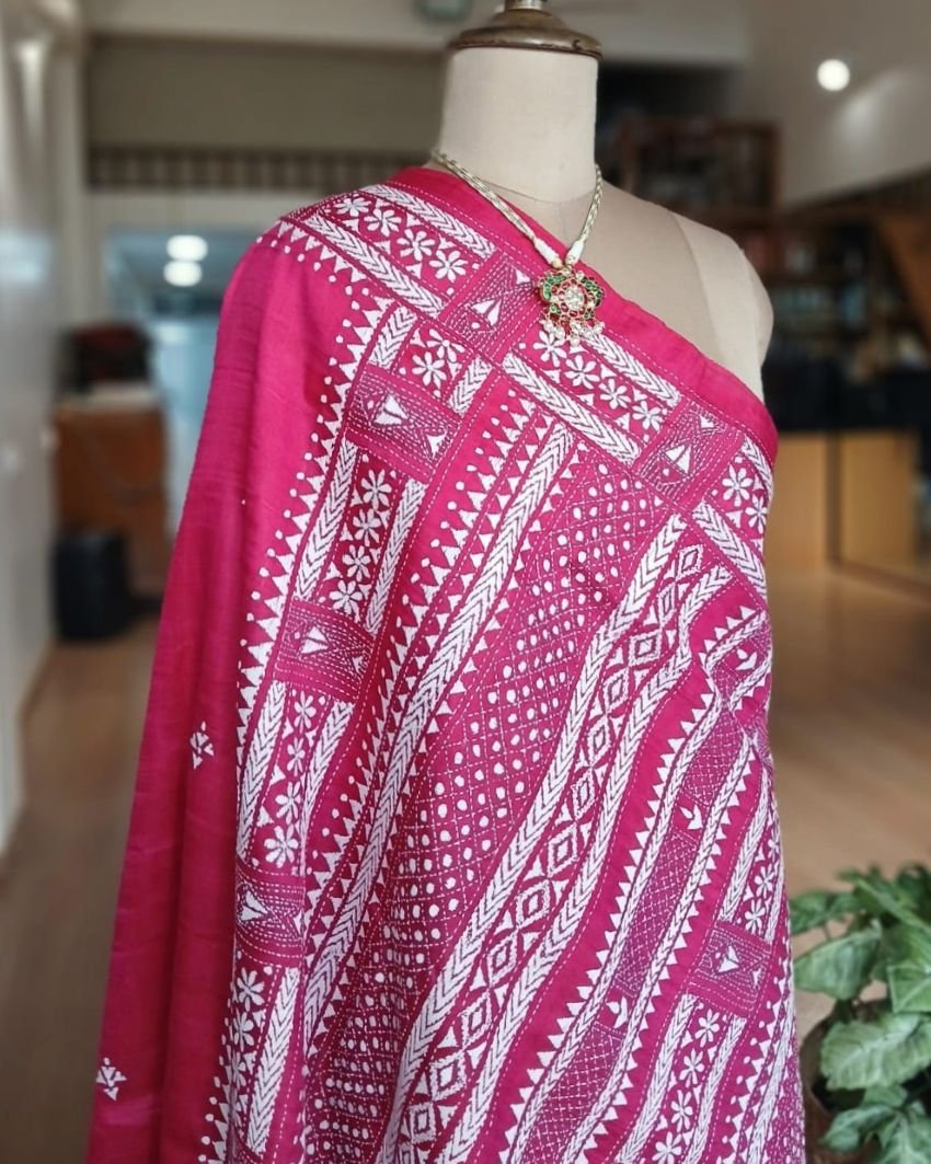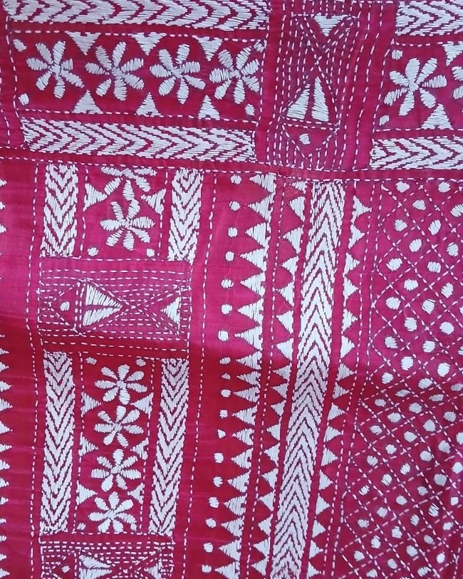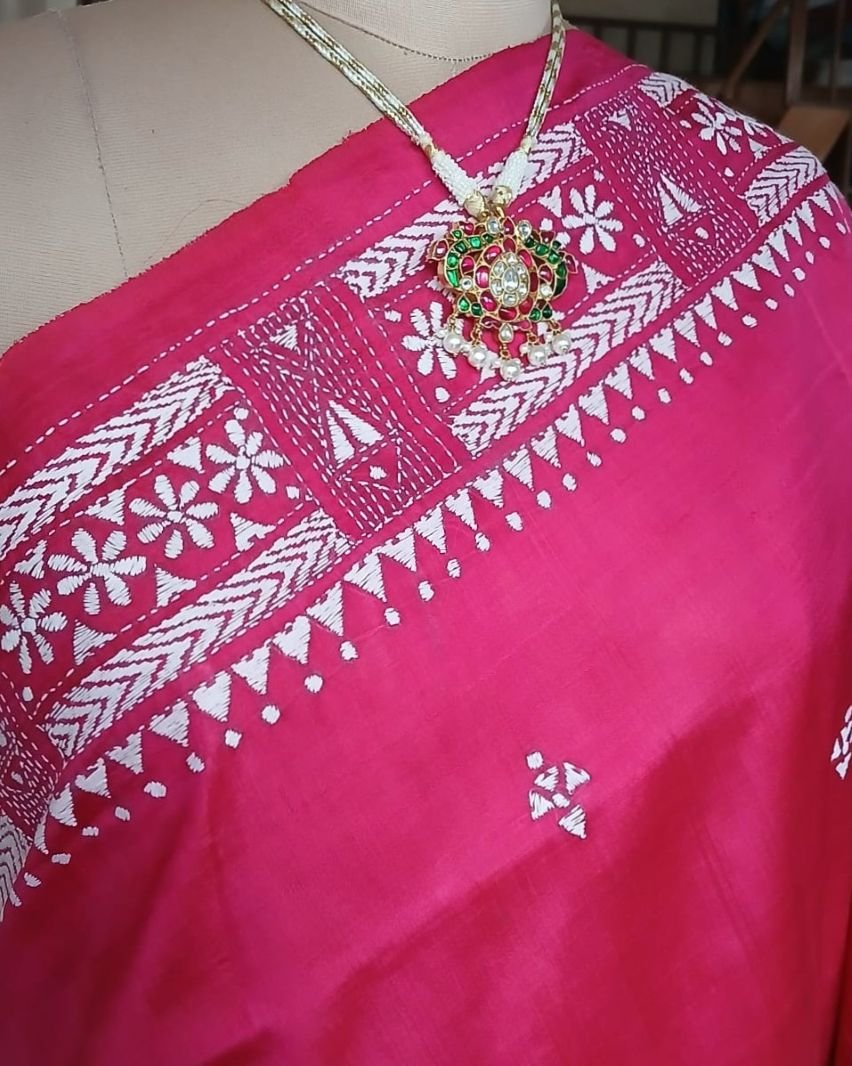 Hand embroidered Santiniketan kantha saree in pure Bisnupuri silk.