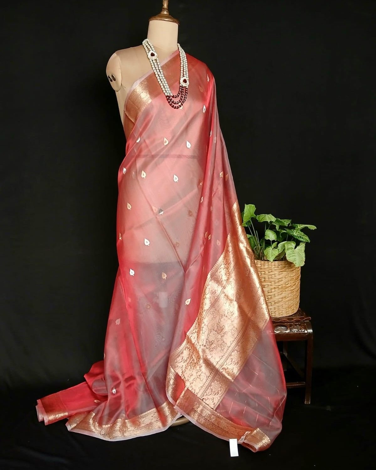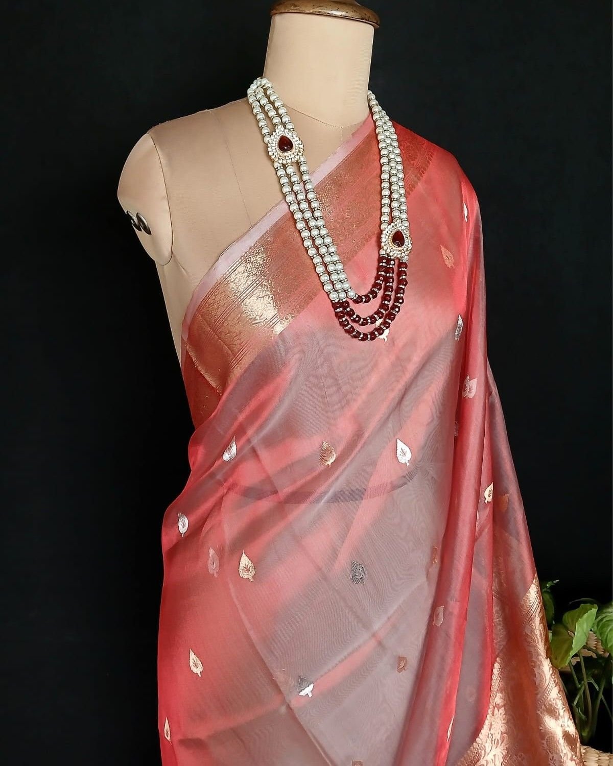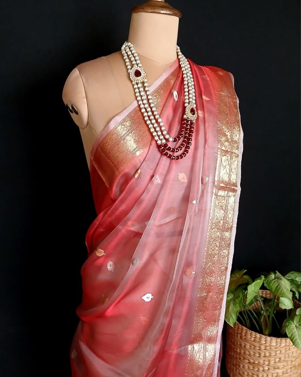 Sophisticated Tissue Zari Banarasi, ideal for wedding events and cocktail parties. See more details below.