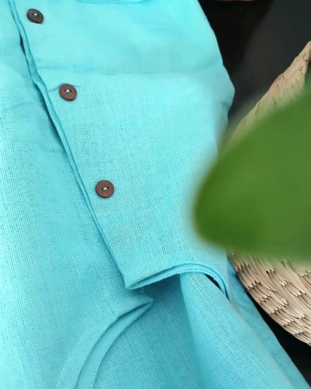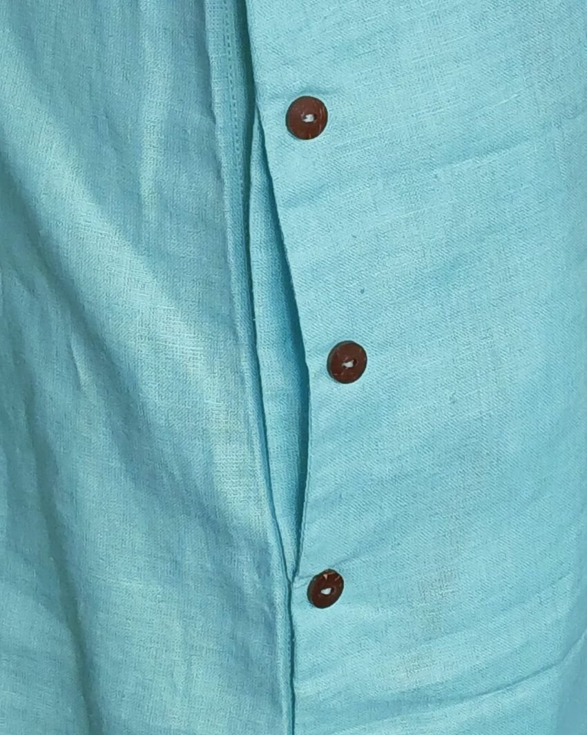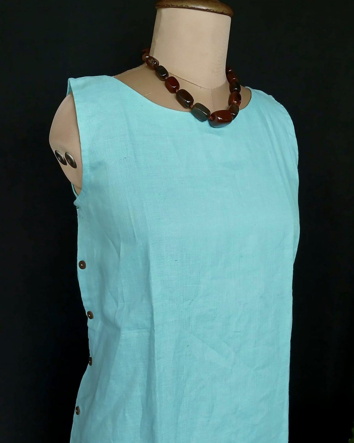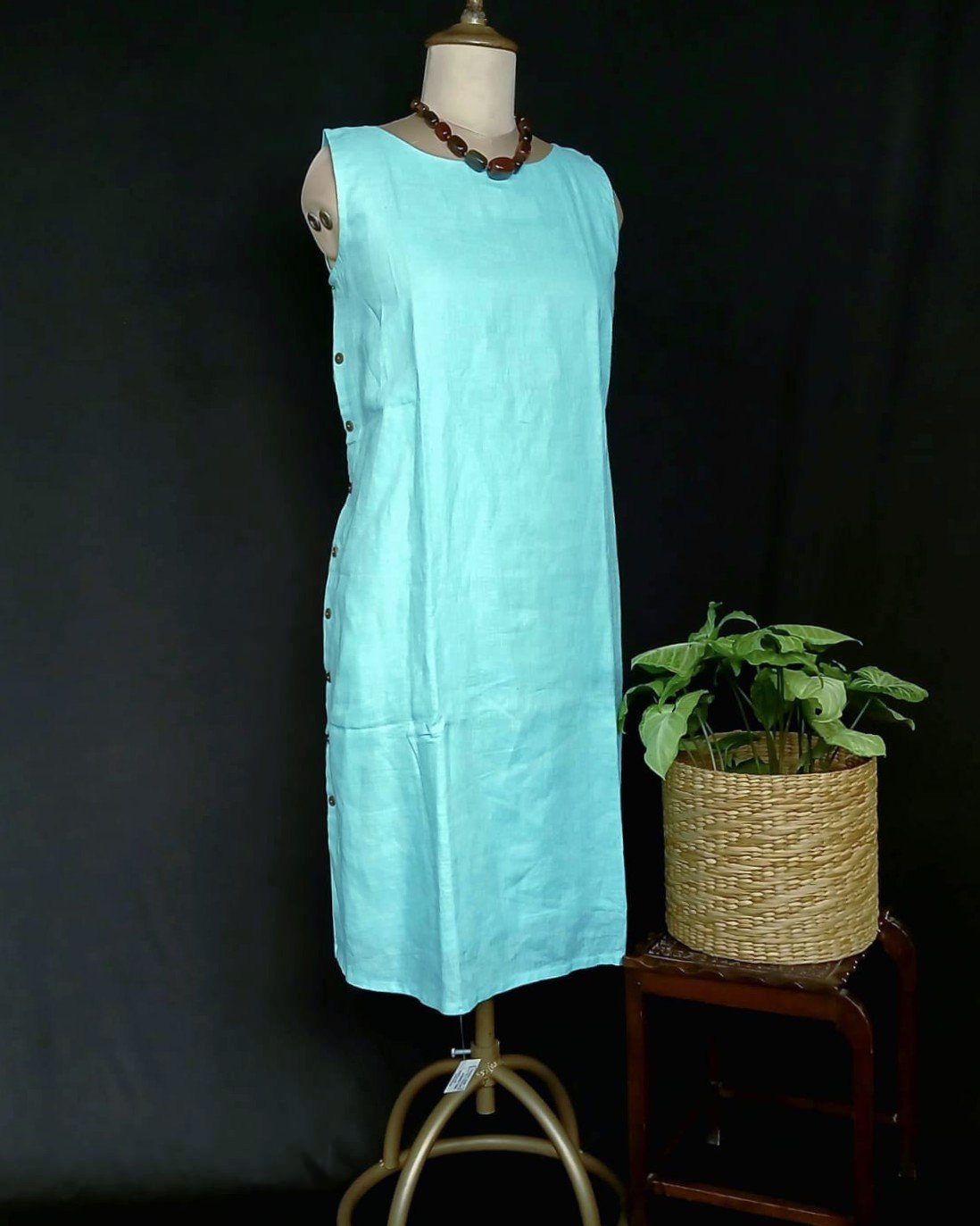 Stylish linen dress. The dress has decorative wooden buttons on both sides.