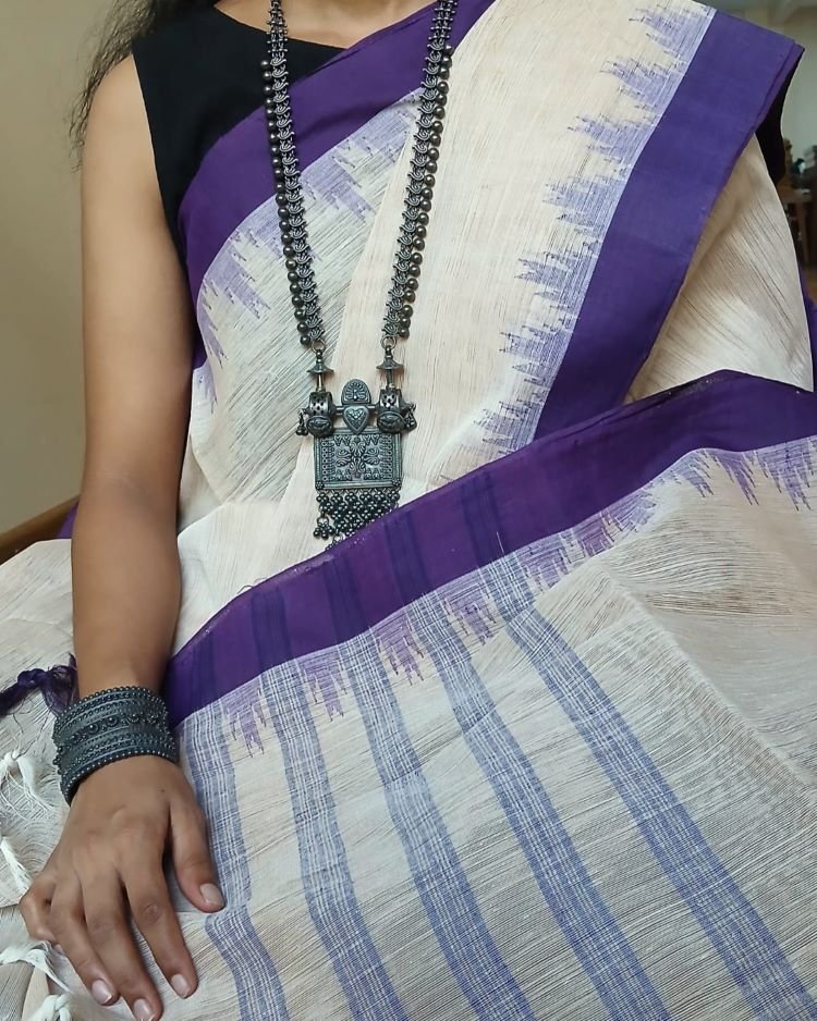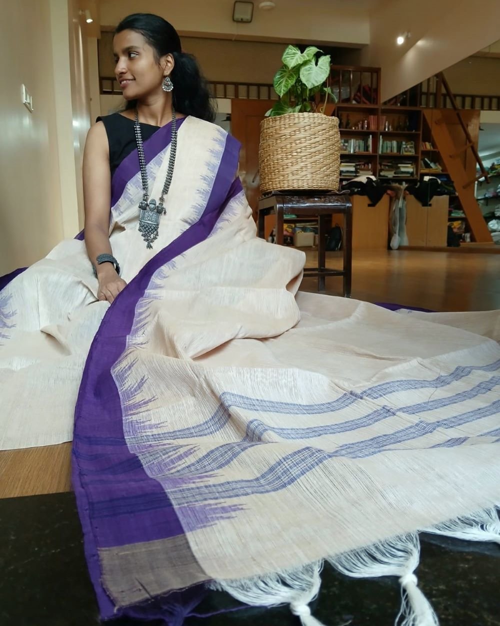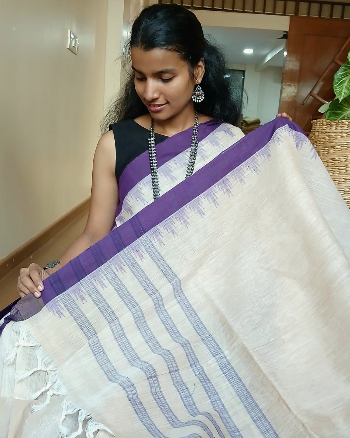 It’s an airy and light saree, with a kuppadam temple border and striped palla. Perfect for summer season.
