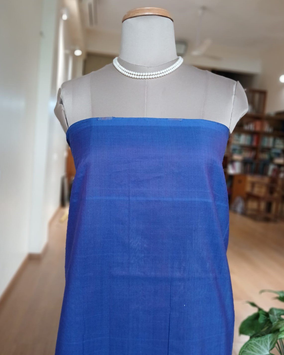 It has contrast borders and pallu with bands. The material is mercerised cotton and drapes well. Includes plain blousepiece..