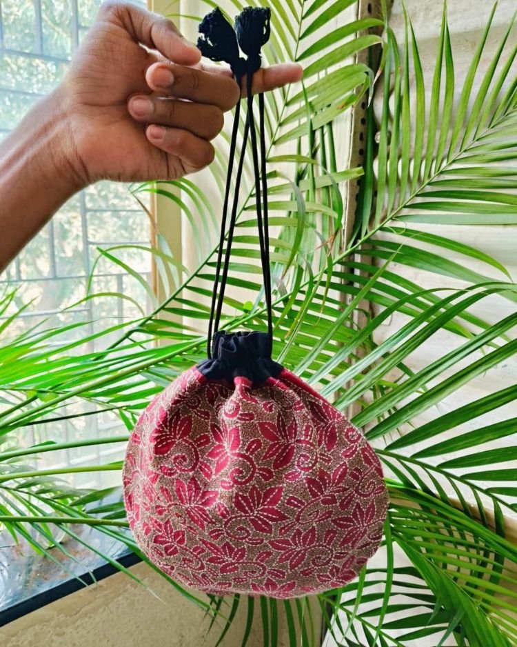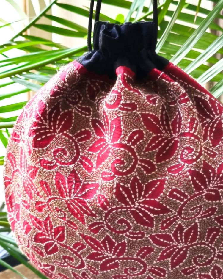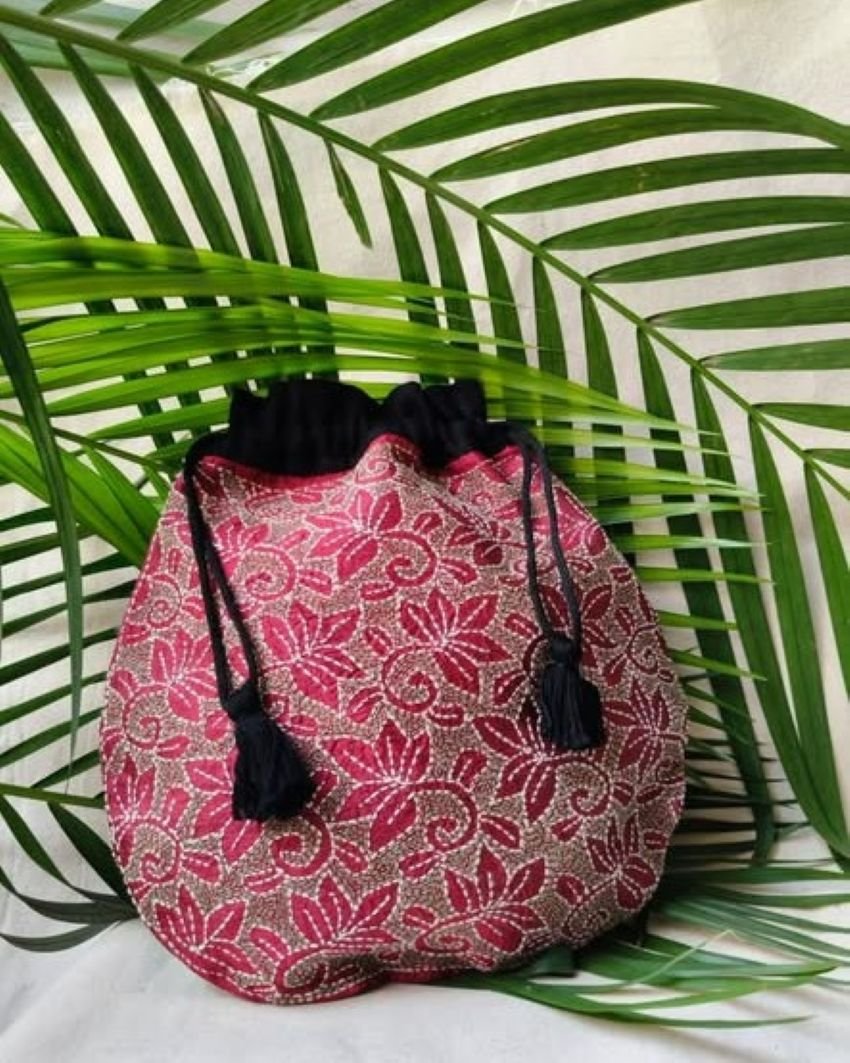 A charming Tussar Silk Kantha Batua (Drawstring Bag), hand-embroidered in Santiniketan.
